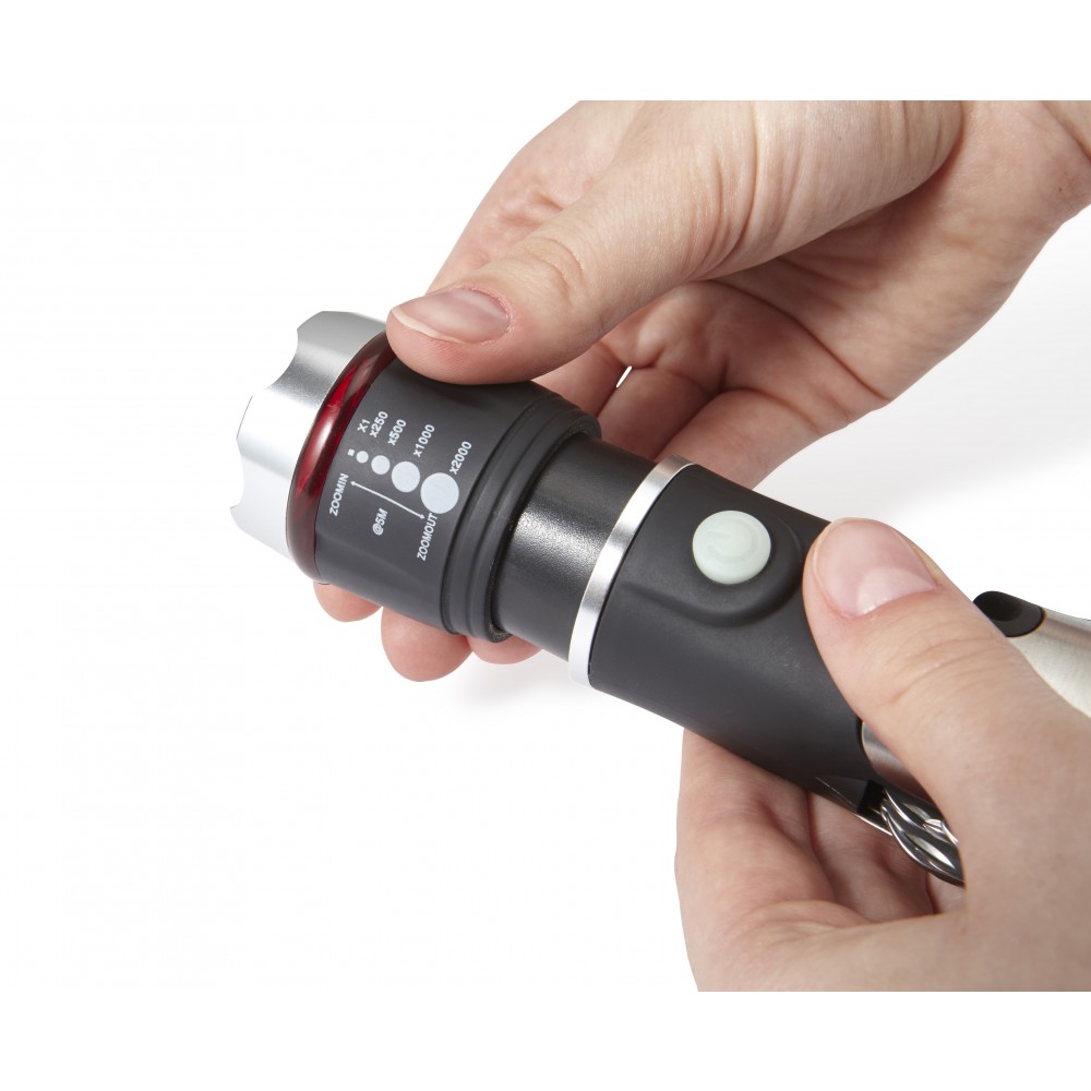 Lámpa biztonságiöv-vágóval, vészkalapáccsal. Az alsó részben kivehető zsebkés teszi igazán multifunkcióssá ezt az eszközt. Az elemet tartalmazza. Fém. Emblémázás: Gravírozás, Tamponnyomás