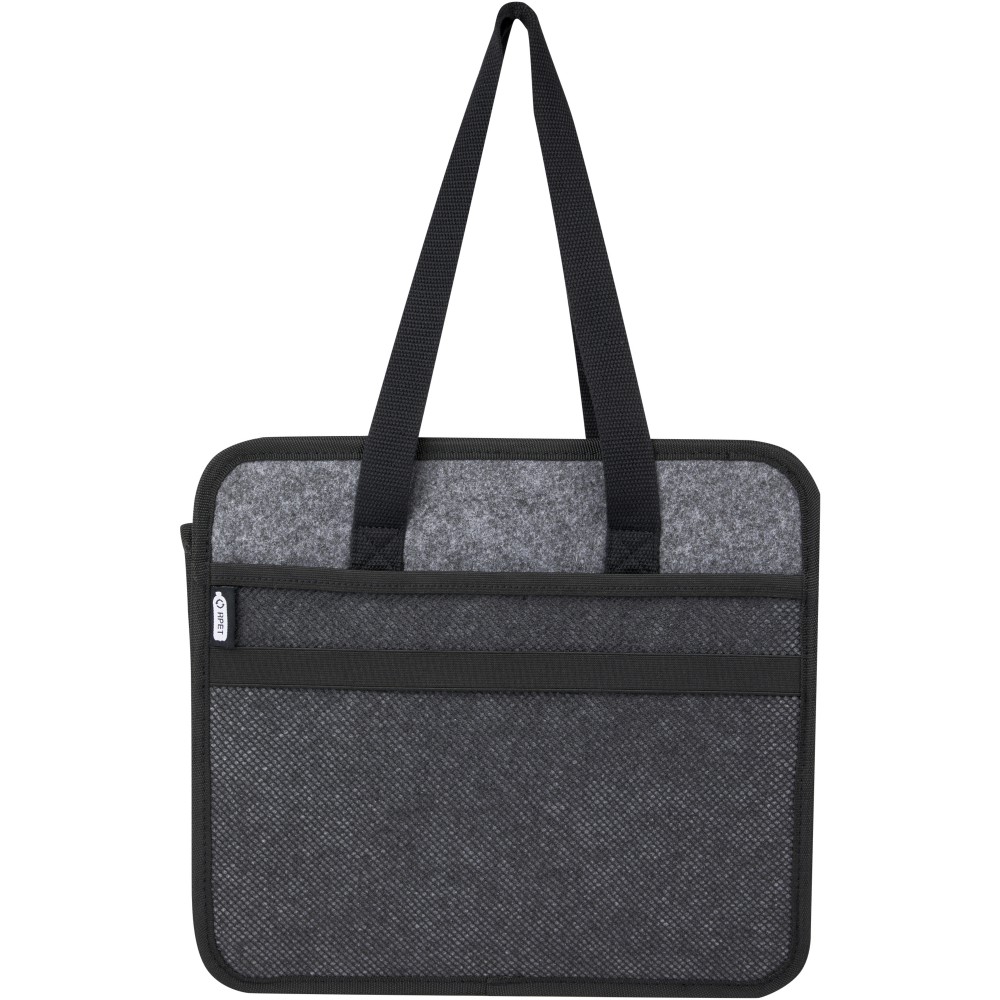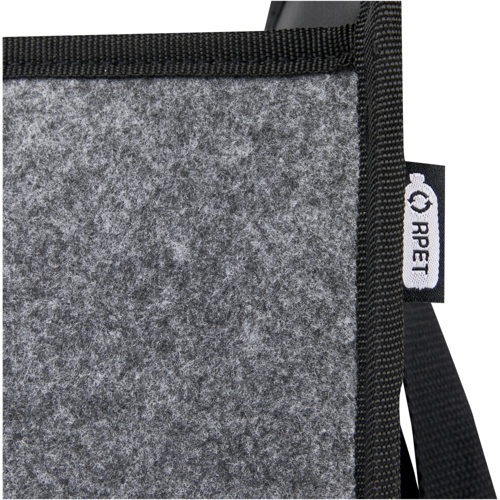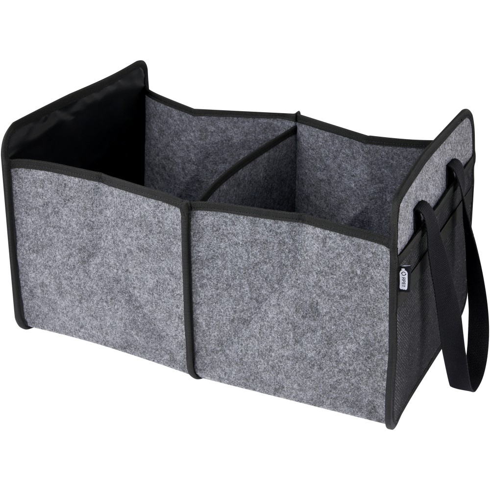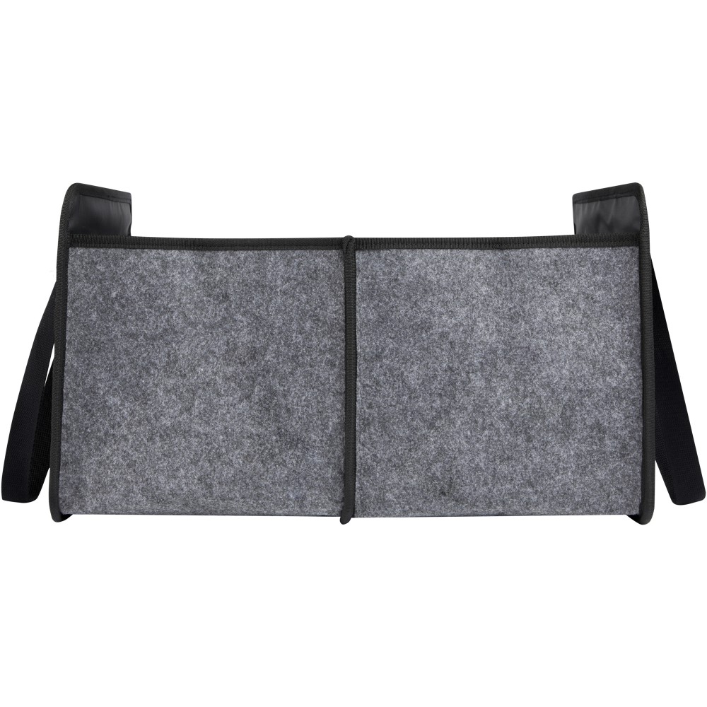 Puha és tartós, kiváló minőségű, GRS tanúsítvánnyal rendelkező újrahasznosított filcből készült összecsukható táska. 2 nagy rekesszel, megerősített alsó lapokkal, elülső zsebbel, hálós zsebbel és 2 hosszú szövött pamut füllel (30 x 2,5 cm). Ideális elektromos járműve töltőkábeleinek tárolására, élelmiszerek szállítására vagy egyszerűen a rend fenntartására az autóban vagy otthon. Minden erőfeszítés nélkül a helyére hajtható, és egy rugalmas pánt gondoskodik arról, hogy szépen összecsukva maradjon. Zárt mélység: 4,5 cm. Nyitott mélység: 48 cm. Emblémázás: Hímzés, Szitanyomás