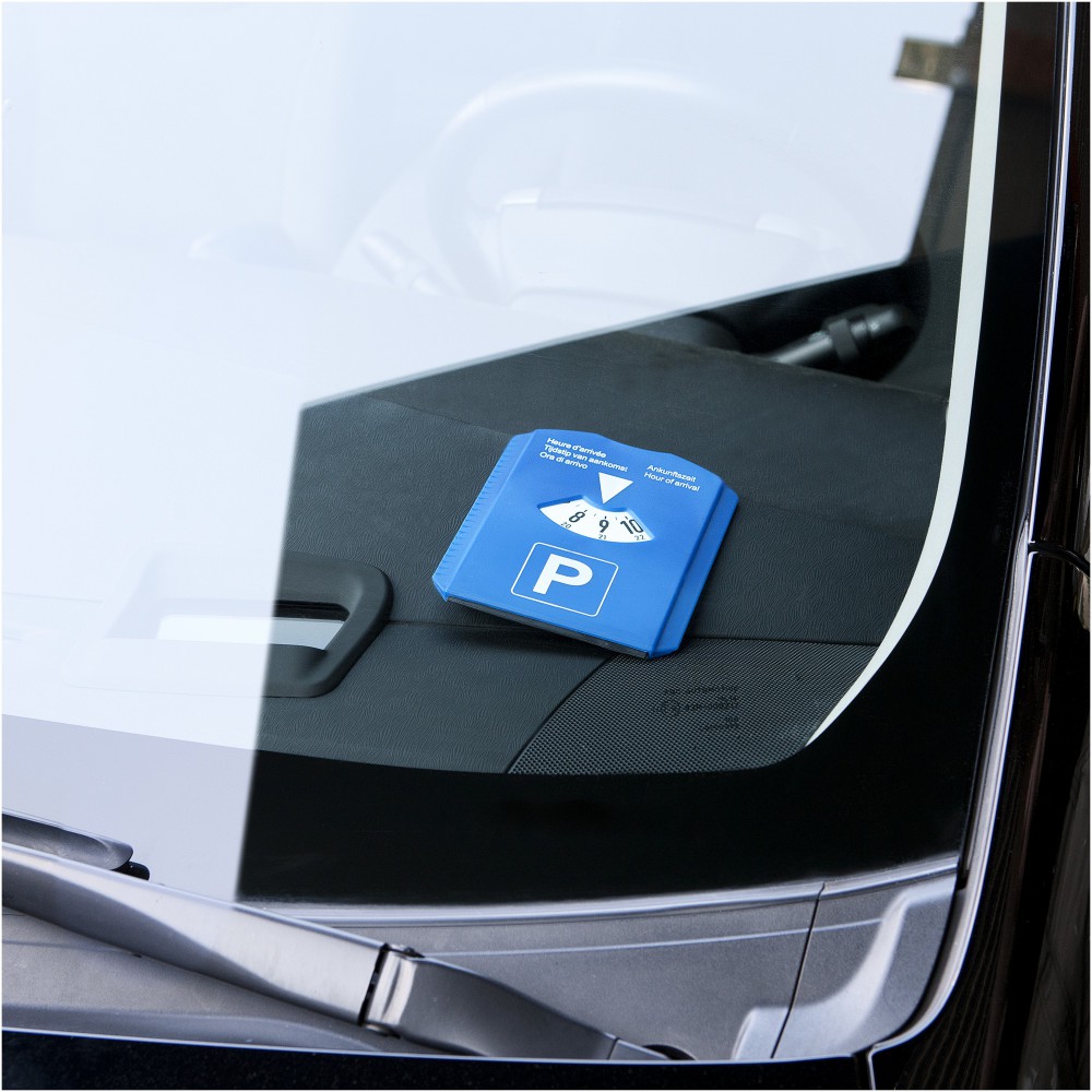 Parkolótárcsa jégkaparóval, gumitörlővel, érmetartóval és a gumi futófelületét ellenőrző mérővel. A lemez hátulján nagy fehér felület a logóknak. A lemezen az Érkezési idő szövegezés hollandul, angolul, franciául, németül és olaszul is megjelenik. A szabályok helytől függően változhatnak. Emblémázás: Tamponnyomás
