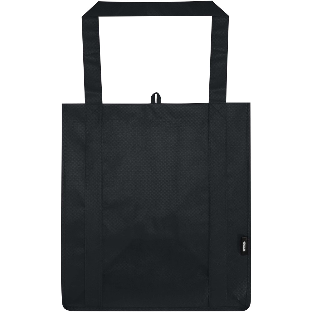 A Liberty GRS tanúsítvánnyal rendelkező újrahasznosított bevásárlótáska tartós és szakadásálló nem szőtt RPET anyagból készült, megerősített aljrésszel, amely extra stabilitást és sokoldalú felhasználást biztosít. A táska nagy méretű főrekesszel és 25 cm hosszú fülekkel rendelkezik, így kényelmesen hordozható. Űrtartalma: 29 liter. Teherbírás: akár 12 kg. Emblémázás: Szitanyomás