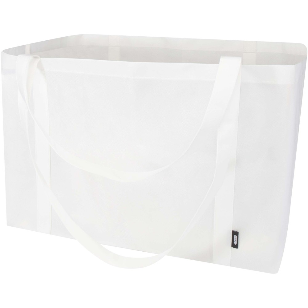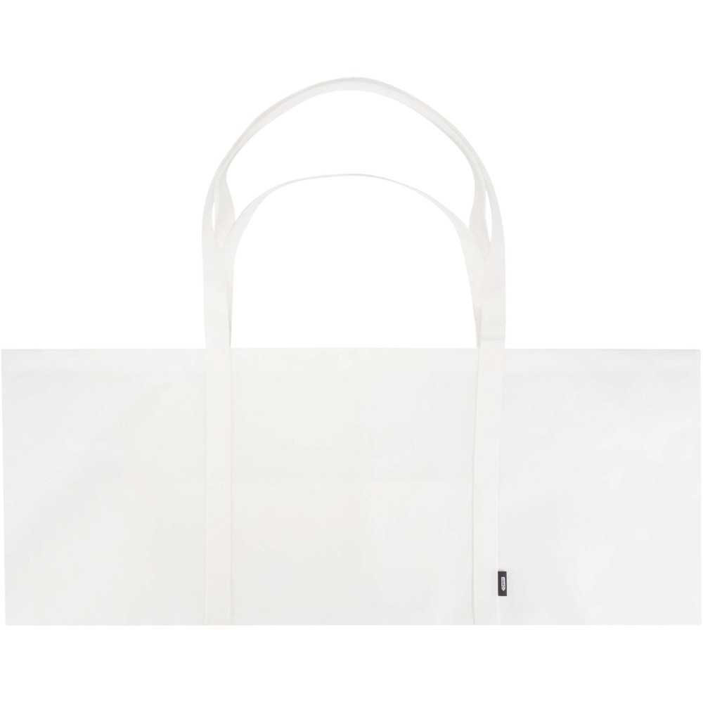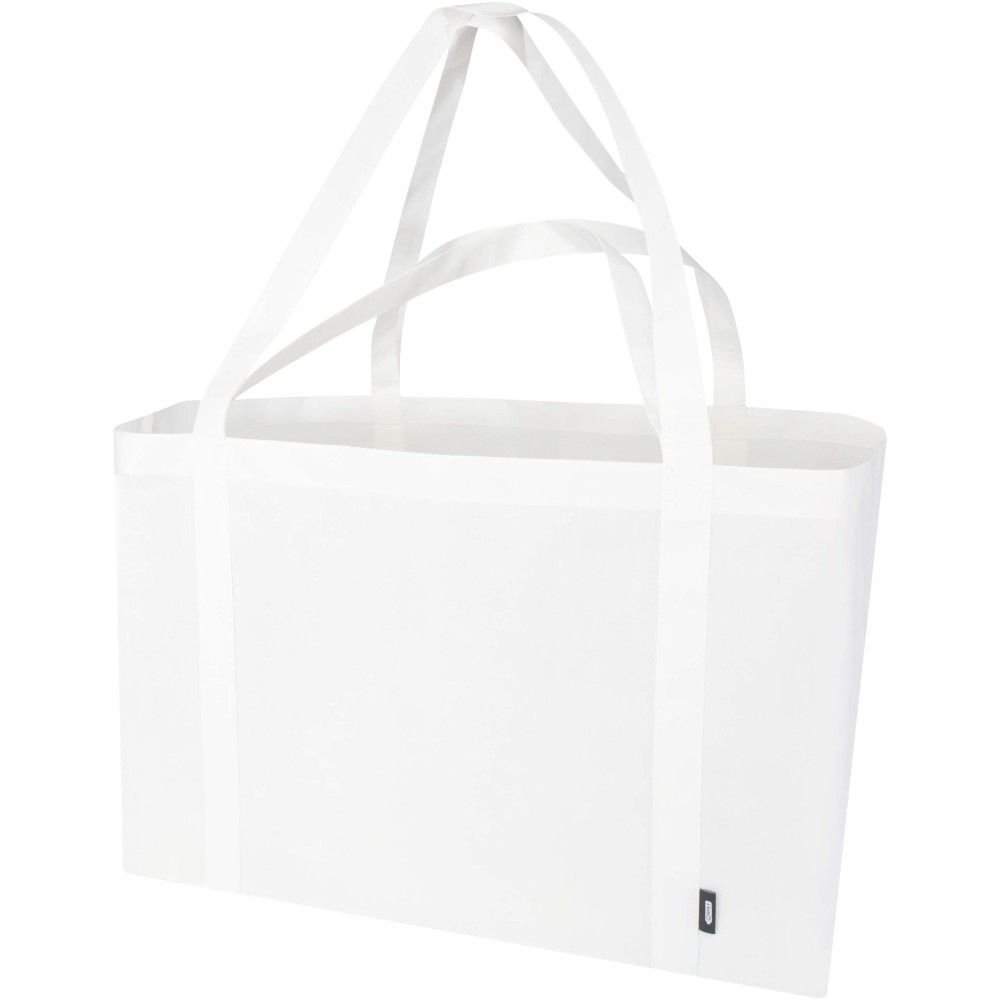 A Jumbo GRS tanúsítvánnyal rendelkező újrahasznosított bevásárlótáska tartós és szakadásálló nemszőtt RPET anyagból készült, extra nagy, akár 65 literes kapacitással rendelkezik, így ideális nagybevásárláshoz, strandoláshoz vagy kirándulásokhoz. Megerősített rövid (24 cm) és hosszú (37 cm) fülekkel van ellátva a maximális kényelem érdekében. Könnyen összehajtható és tárolható, ha nincs használatban. Teherbírás: akár 15 kg. Emblémázás: Szitanyomás