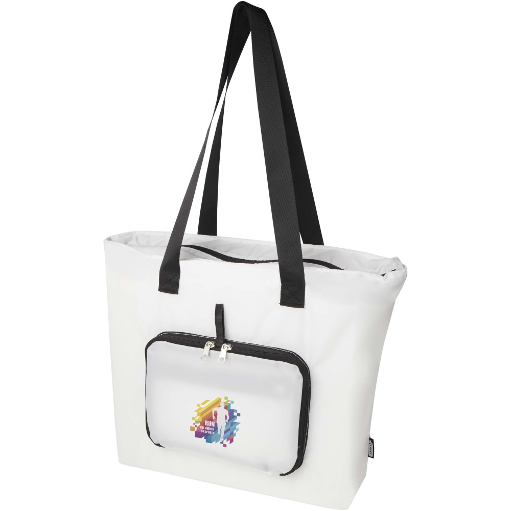 Ez a könnyű, mégis tartós bevásárlótáska a kényelem és praktikusság jegyében készült. Könnyedén a kompakt tasakba hajtható, amelyen hurok található a kényelmes hordozás érdekében - tökéletes rohanós napokra, spontán bevásárlásokhoz vagy tartalék táskaként. Tágas cipzáras főrekesszel, cipzáras elülső zsebbel és két hosszú, sima szövött anyagból készült fogantyúval rendelkezik. PVC-mentes újrahasznosított poliészterből készült. Űrtartalma: 16 liter. Emblémázás: Szitanyomás