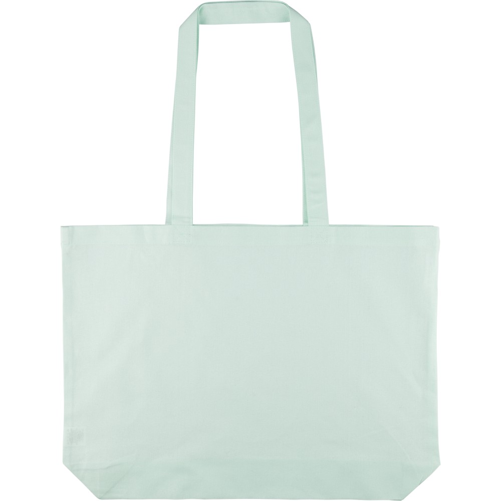 Oeko-Tex minősítésű, 140 g/m2 pamutból készült bevásárlótáska 10 cm-es talppal és 70 cm hosszúságú, 2,5 cm szélességű hosszú fülekkel. Pasztell színekben elérhető: PMS 9562U (zöld), 162U (narancs), 317U (kék) és 522U (lila). Oeko-Tex címkével ellátva. Emblémázás: Szitanyomás