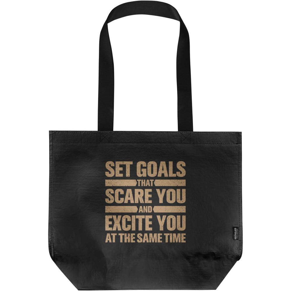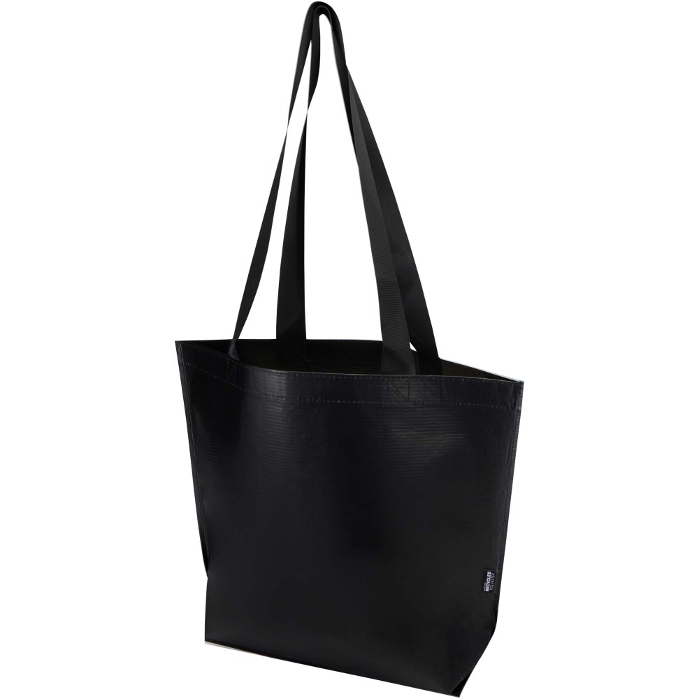 Duplán laminált aljú bevásárlótáska 150 g/m2 súlyú, GRS tanúsítvánnyal rendelkező, újrahasznosított RPET anyagból készül. A dupla laminálásnak köszönhetően a táska fokozott tartóssággal és vízlepergető tulajdonságokkal rendelkezik, így megbízható megoldást nyújt a mindennapi használat során. A termék tágas, nyitott főrekesszel, megerősített hordfülekkel és extra kapacitást biztosító széles alsó résszel rendelkezik. A 18 literes űrtartalmú táska teherbírása 10 kg, így esztétikus és praktikus választás bevásárláshoz, szakvásárokra vagy reprezentatív céges eseményekre. Az újrahasznosított alapanyag révén kiválóan alkalmas öko-szemléletű emblémázott ajándéknak. Emblémázás: Szitanyomás