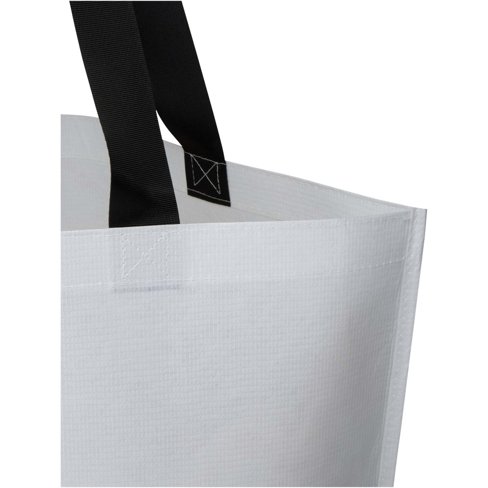 A 150 g/m2 súlyú, GRS tanúsítvánnyal rendelkező újrahasznosított RPET alapanyagból készült Duo bevásárlótáska duplán laminált alsó résszel rendelkezik a fokozott tartósság és vízállóság érdekében. A táska tágas, nyitott főrekesszel, megerősített hordozófülekkel és extra kapacitást biztosító széles talprésszel készült. A 30 literes űrtartalmú modell teherbírása 15 kg, így megbízható és praktikus választás élelmiszer-vásárláshoz, szabadidős tevékenységekhez vagy rövidebb utazásokhoz. Emblémázás: Szitanyomás