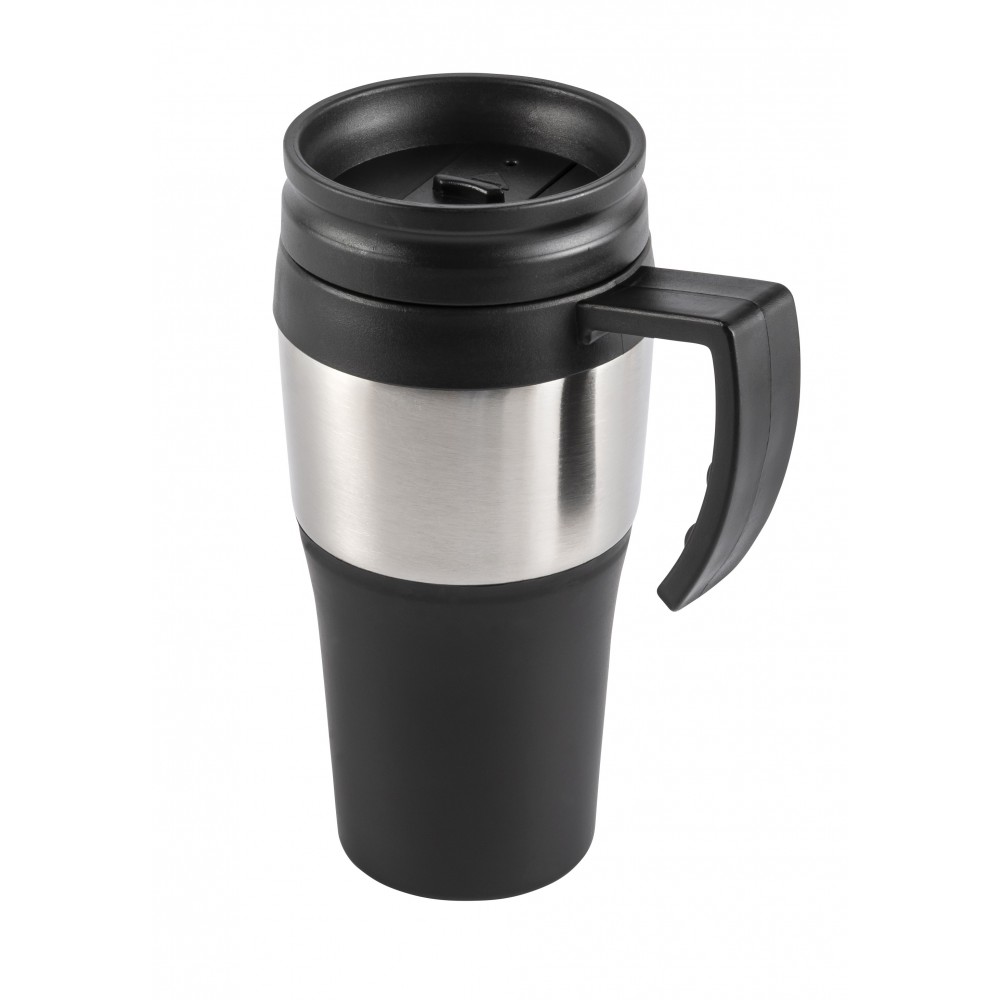 Termoszbögre rozsdamentes acélból és műanyagból. Nem szivárgásmentes. Mosogatógépben nem tisztítható. 500 ml. BPA-mentes műanyag. Emblémázás: Gravírozás, Tamponnyomás