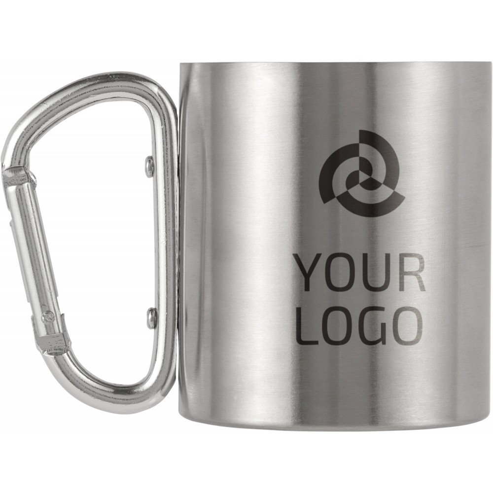 Duplafalú utazóbögre karabineres füllel. Űrtartalom: 185 ml. Rozsdamentes acél. Emblémázás: Bögredekor, Gravírozás, Tamponnyomás