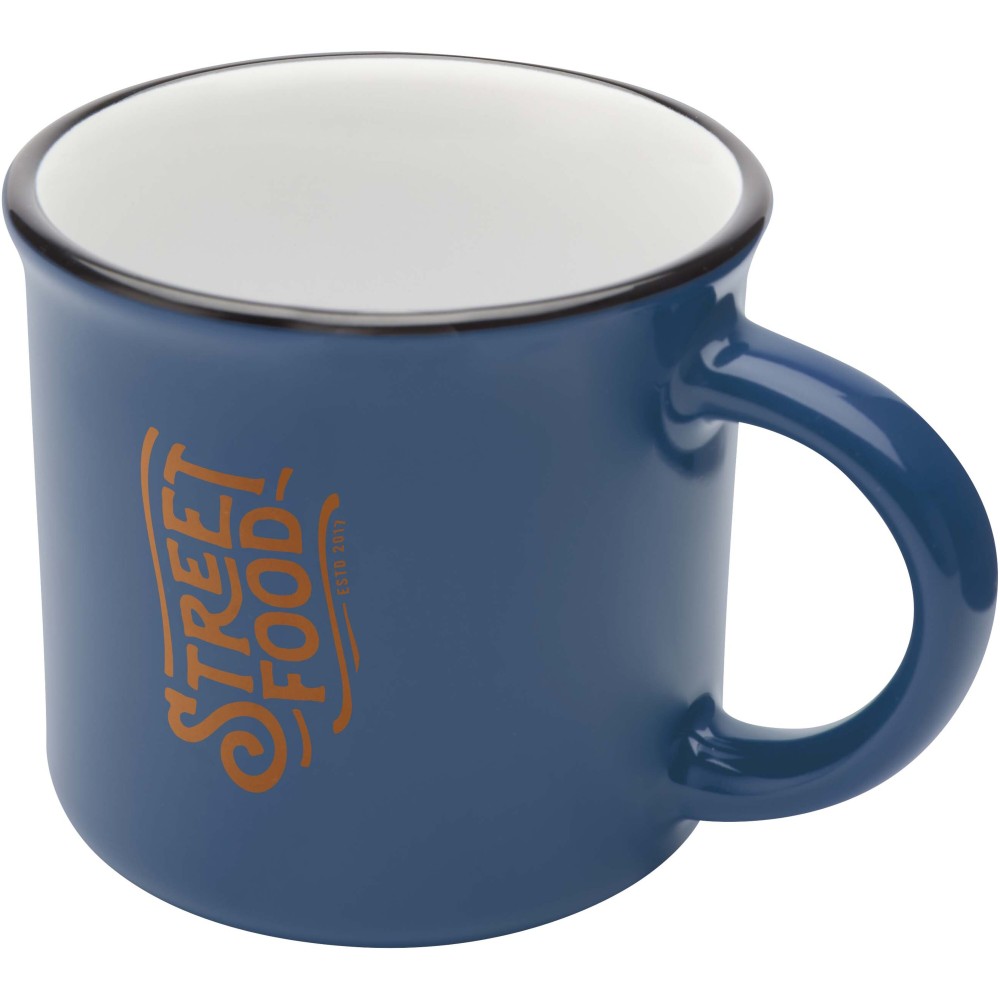 Vintage stílusú kerámia bögre, ideális a reggeli kávéhoz vagy teához. Mosogatógépben mosható. Újrahasznosított kartondobozban szállítjuk. Űrtartalma: 240 ml. Emblémázás: Bögredekor