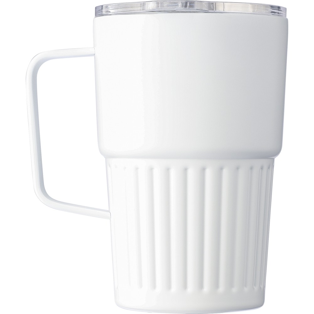Újrahasznosított rozsdamentes acél útibögre, 450 ml. A belső 304-es, a külső 201-es rozsdamentes acélból készült, bordás markolattal és masszív fogantyúval, műanyag, csúszózáras fedéllel. Gravírozott újrahasznosított logó található a bögrén. Csomagolása barna papírdoboz. Emblémázás: Bögredekor, Gravírozás