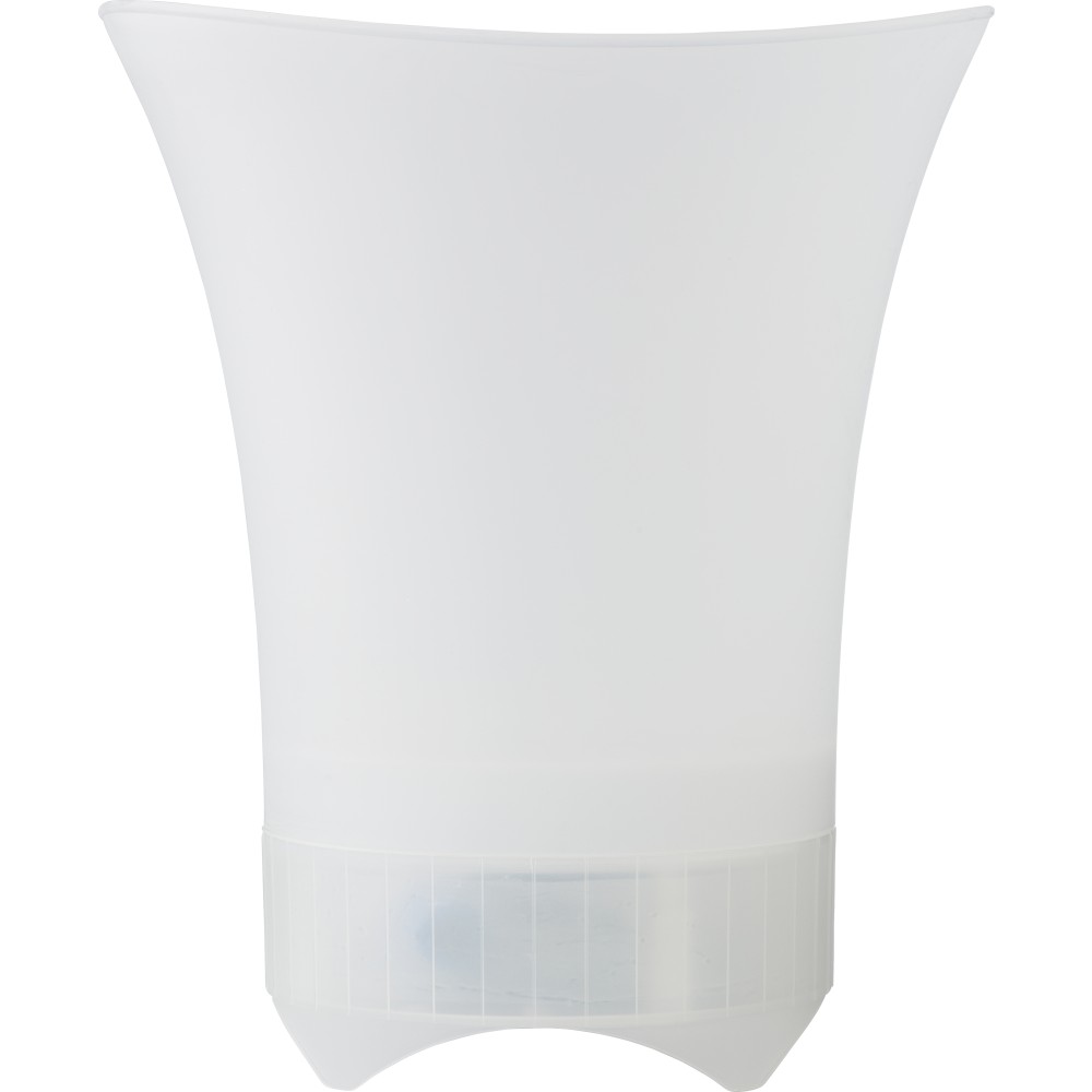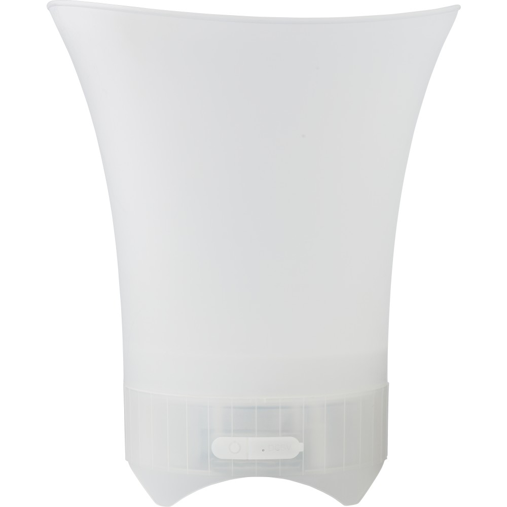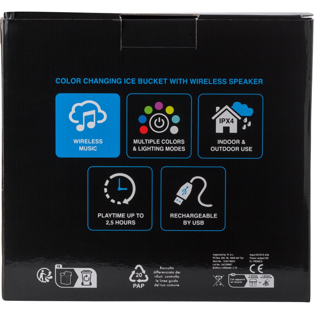 ABS jegesvödör hangszóróval. Színváltó fények az alján és vezeték nélküli technológia. 1200 mAh kapacitású akkumulátor. Darabonként színes díszdobozba csomagolva érkezik. Emblémázás: Tamponnyomás