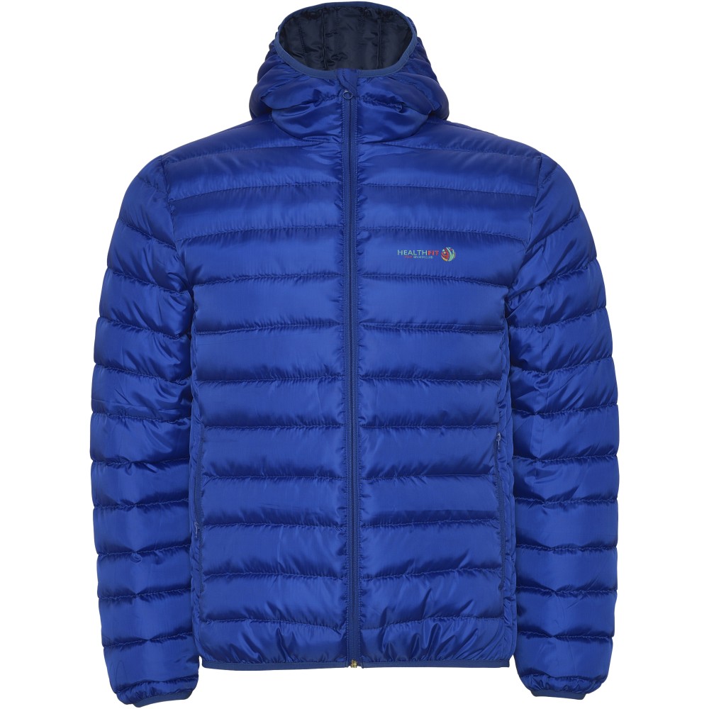 Pehely tapintású férfi steppelt dzseki kapucnival, tasakkal. Fordított cipzárakkal, hozzá illő állvédővel. Két cipzáras elülső zseb. Gumis kézelő, a alj- és a kapucniszegély. Kontrasztos belső bélés. Könnyű és összehajtható ruhadarab. Vízálló. Szélálló modell. 100% poliészter, 290 g/m2. Bélés: 100% poliészter. Töltet: 100% poliészter. Emblémázás: Hímzés