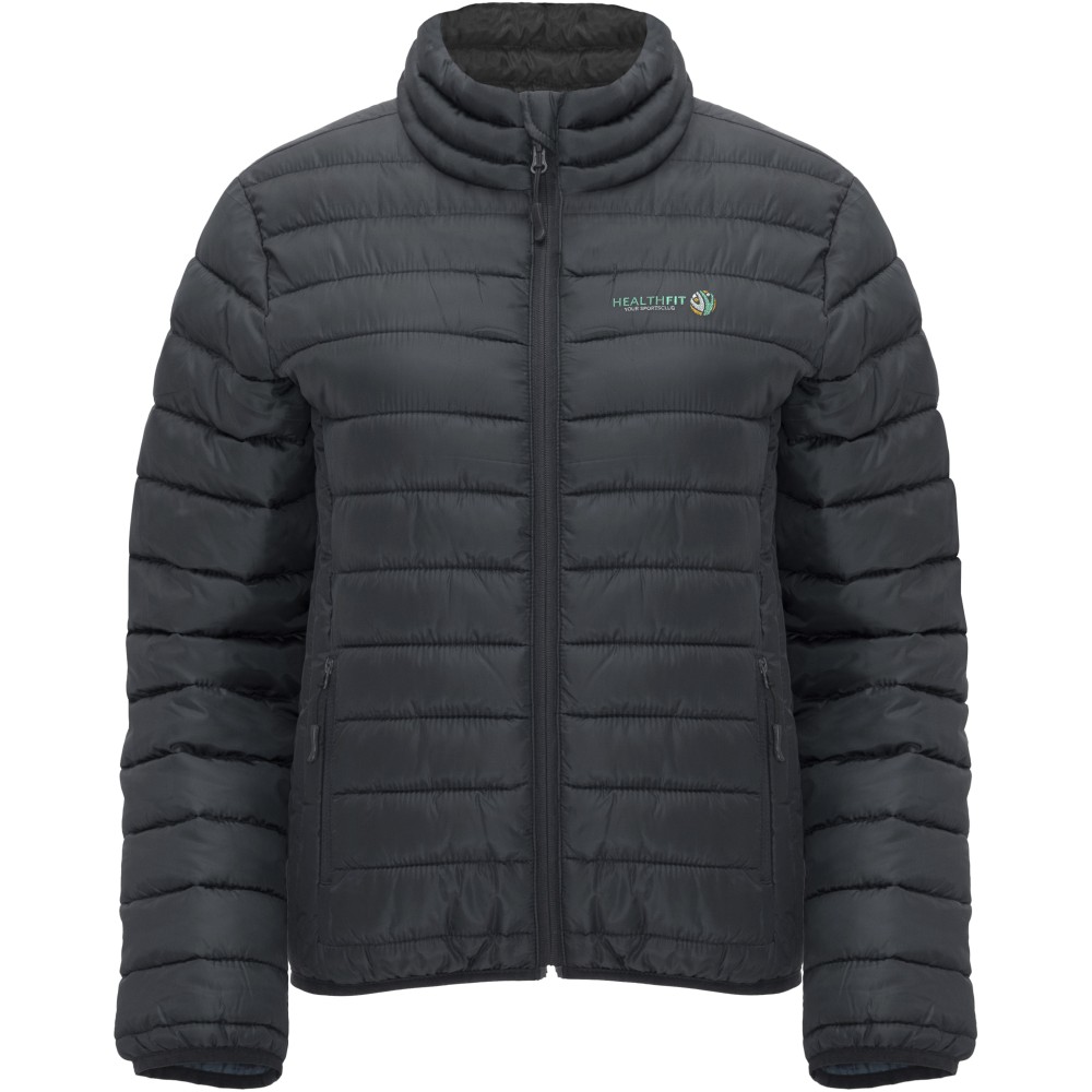 Női, karcsúsított, steppelt dzseki tollszerű tapintású töltettel, tasakkal. Fordított cipzárak, színben illeszkedő állvédővel és cipzárral. Két cipzáras elülső zseb. Gumis szegély a galléron, a kézelőn és az aljon. Kontrasztos színű bélés. Könnyű és összehajtható ruhadarab. Vízálló. Szélálló. 100% poliészter, 290 g/m2. Bélés és töltet: 100% poliészter. Emblémázás: Hímzés