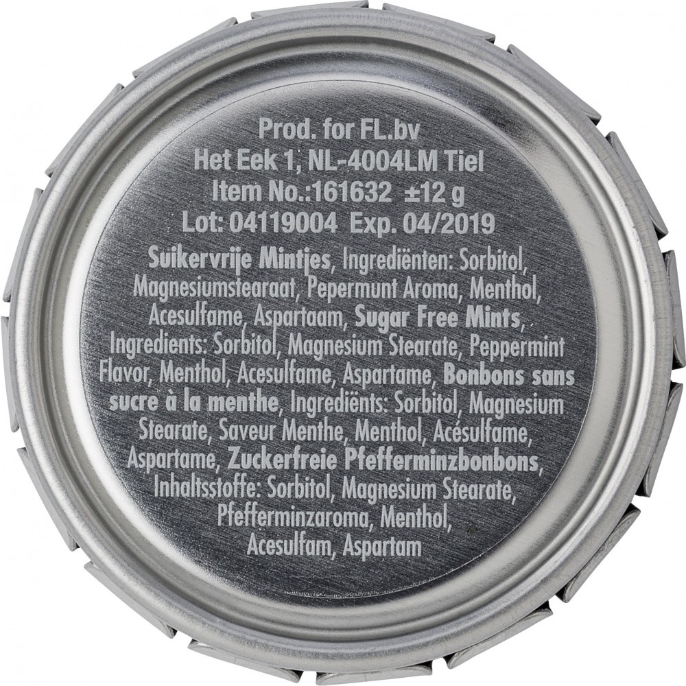 Pattintós fém cukorkásdoboz. 12 g cukormentes mentolos cukorkával. Emblémázás: Gravírozás, Tamponnyomás, UV nyomtatás