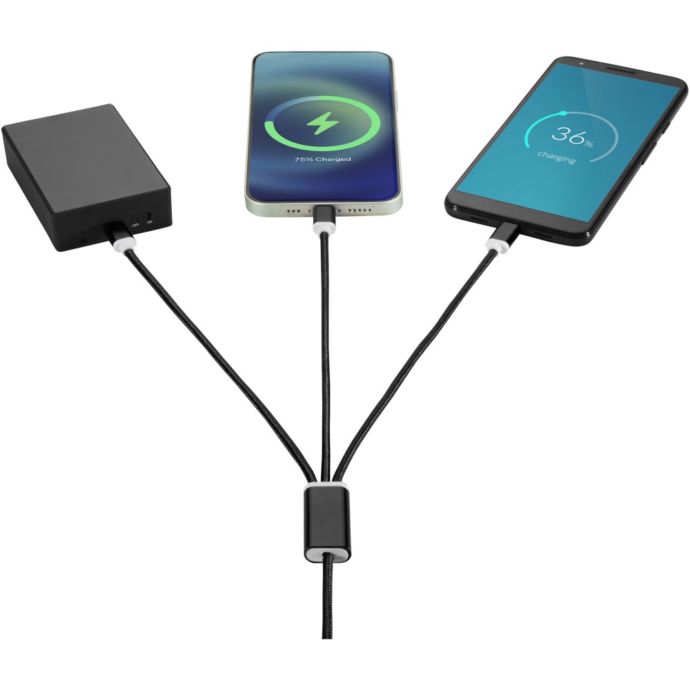 Fonott nejlon töltőkábel 5 különböző csatlakozóval: C típusú bemenet, USB-A bemenet, C típusú kimenet, Apple iOS kimenet és mikro USB kimenet. Ez lehetővé teszi a kábel használatát C típusú kimeneti eszközökkel is, amelyek az új generációs telefonok és MacBook számítógépek részét képezik. A kábel hossza 100 cm. 2 az 1-ben kimenet 2A-ig. C típusú kimenet 3A-ig. Emblémázás: Gravírozás