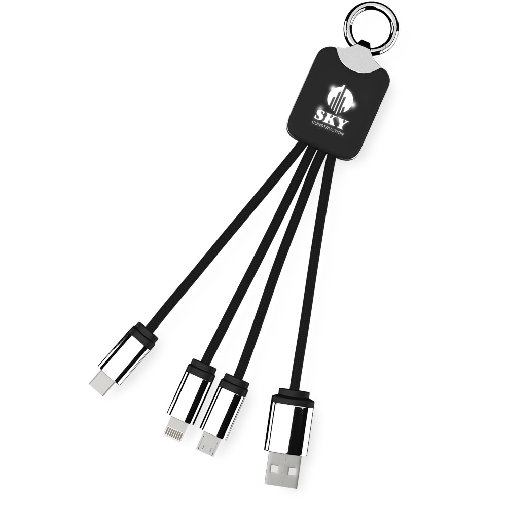 Világító logós töltőkábel gumi és fém bevonattal, három csatlakozóval (Type-C, Android, iPhone). Egyszerre akár három készülék is tölthető. Kábelek hossza (dugókkal együtt): 10 cm. Az újrahasznosított PET műanyag kábel és csomagolás újrahasznosított papírból és újrahasznosított műanyagból készül. Emblémázás: Gravírozás