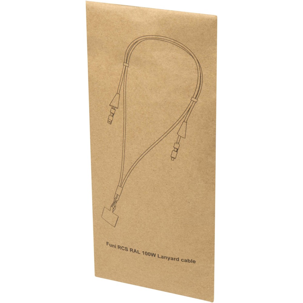 A Funi egy stílusos és praktikus nyakpánt, amely újrahasznosított műanyagból készült. Beépített, 100W gyorstöltést és adatátvitelt támogató 5 az 1-ben kábellel rendelkezik, Type-C és USB-A bemeneti csatlakozókkal, valamint Type-C, Lightning és microUSB kimenettel. Ez a kábel elég erős ahhoz, hogy a legtöbb laptopot, tabletet és okostelefont gyorsan feltöltse. Kompatibilis a CarPlay és Android Auto rendszerekkel, így ideális utazáshoz, munkához vagy mindennapi használatra. Emblémázás: Gravírozás, Tamponnyomás