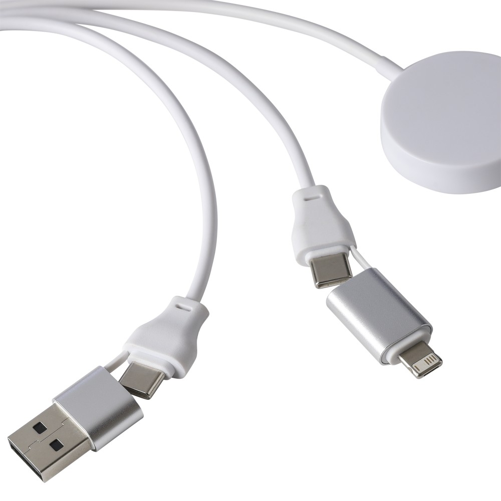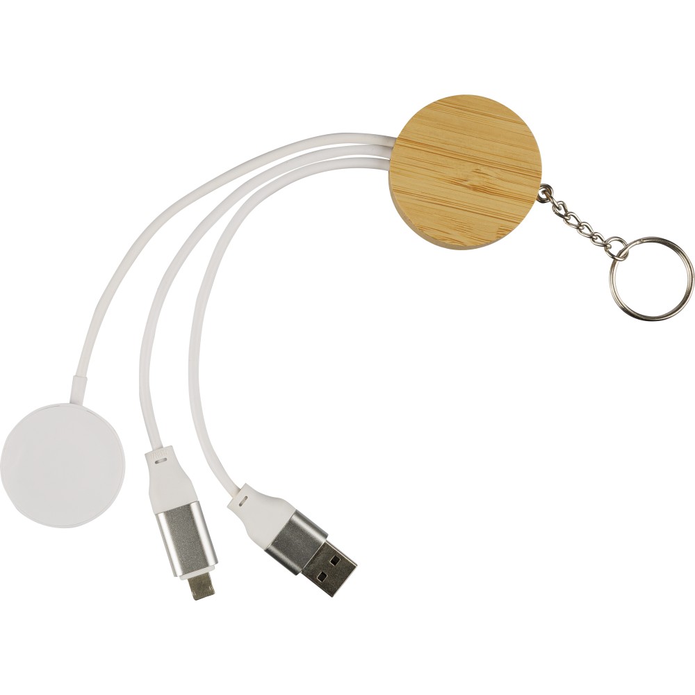 TPE anyagú töltőkábel szett bambusz csatlakozóházzal és fém kulcskarikával, kompakt kulcstartó kialakításban. Tartalmaz PD 65 W gyors töltésre alkalmas kábeleket (2 az 1-ben Type-C/Lightning és USB-A/USB-C), valamint univerzális okosóra töltőt. Barna kartondobozba csomagolva. Emblémázás: Gravírozás, Tamponnyomás,