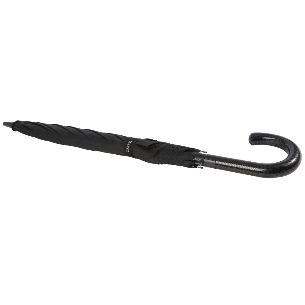 Automatikusan nyíló esernyő pongee poliészter vászonnal és erős, fekete bevonatú vázzal. A kiváló minőségű üvegszálas keret maximális rugalmasságot kínál szeles körülmények között. Görbe fogantyú karbon megjelenésű felülettel és fekete nikkelezett végekkel. Luxe márkajelzés a szőtt címkén a vásznon és a zárópánton. Nagy dekorálható terület minden panelen. Emblémázás: Szitanyomás