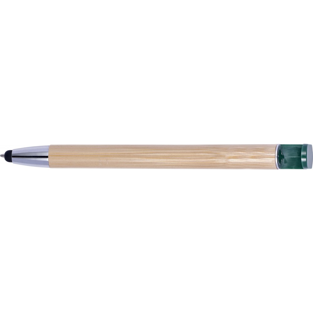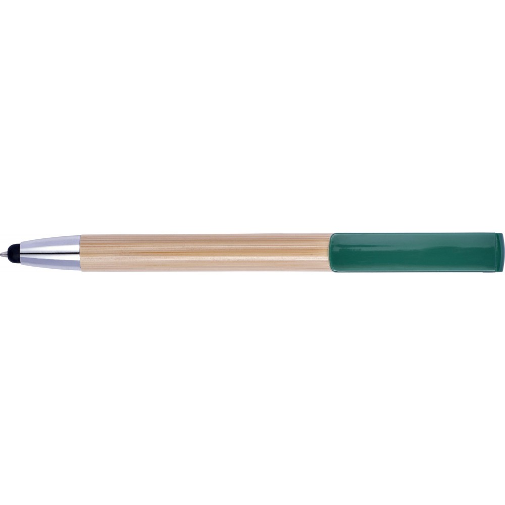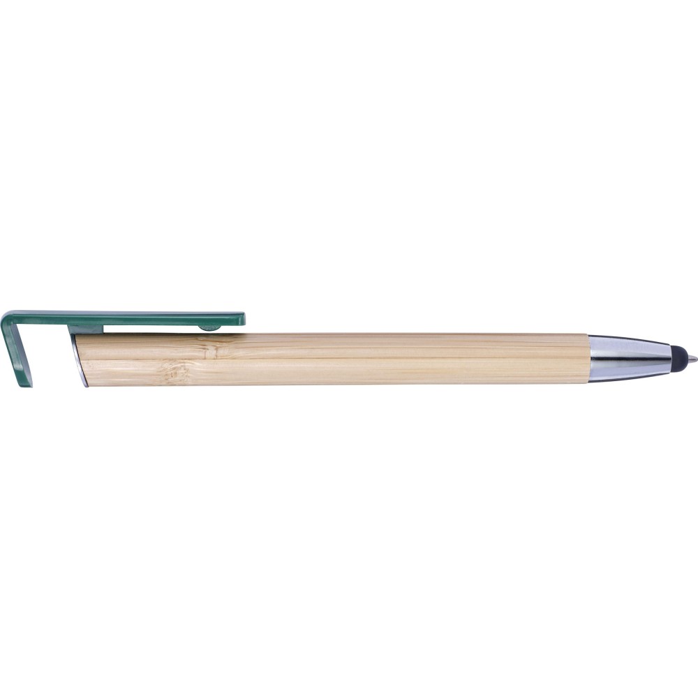 Golyóstoll és érintő kék tollbetéttel, műanyag klipsszel és nyomógombbal. A klipsz nyomógombként funkcionál, és okostelefon-állványként is használható. ABS, bambusz. Emblémázás: Tamponnyomás, UV nyomtatás
