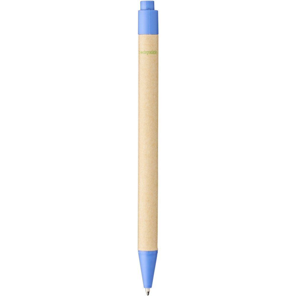 Környezetbarát golyóstoll fekete tollbetéttel, nyomógombos mechanizmussal, biológiailag lebomló papíranyagból készült tolltest és kukorica műanyag kiegészítők. Az újrahasznosított kartondoboz színe nem egységes. Emblémázás: Tamponnyomás, UV nyomtatás