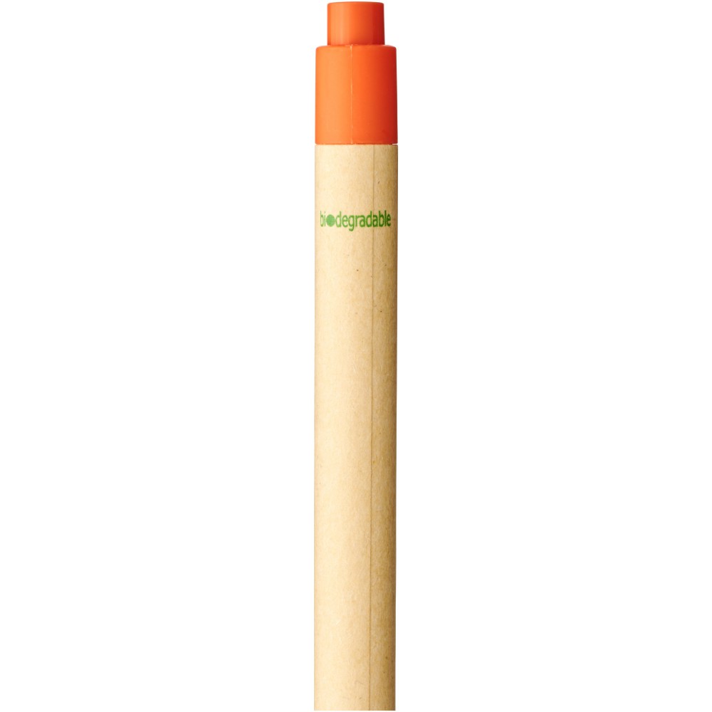 Környezetbarát golyóstoll fekete tollbetéttel, nyomógombos mechanizmussal, biológiailag lebomló papíranyagból készült tolltest és kukorica műanyag kiegészítők. Az újrahasznosított kartondoboz színe nem egységes. Emblémázás: Tamponnyomás, UV nyomtatás