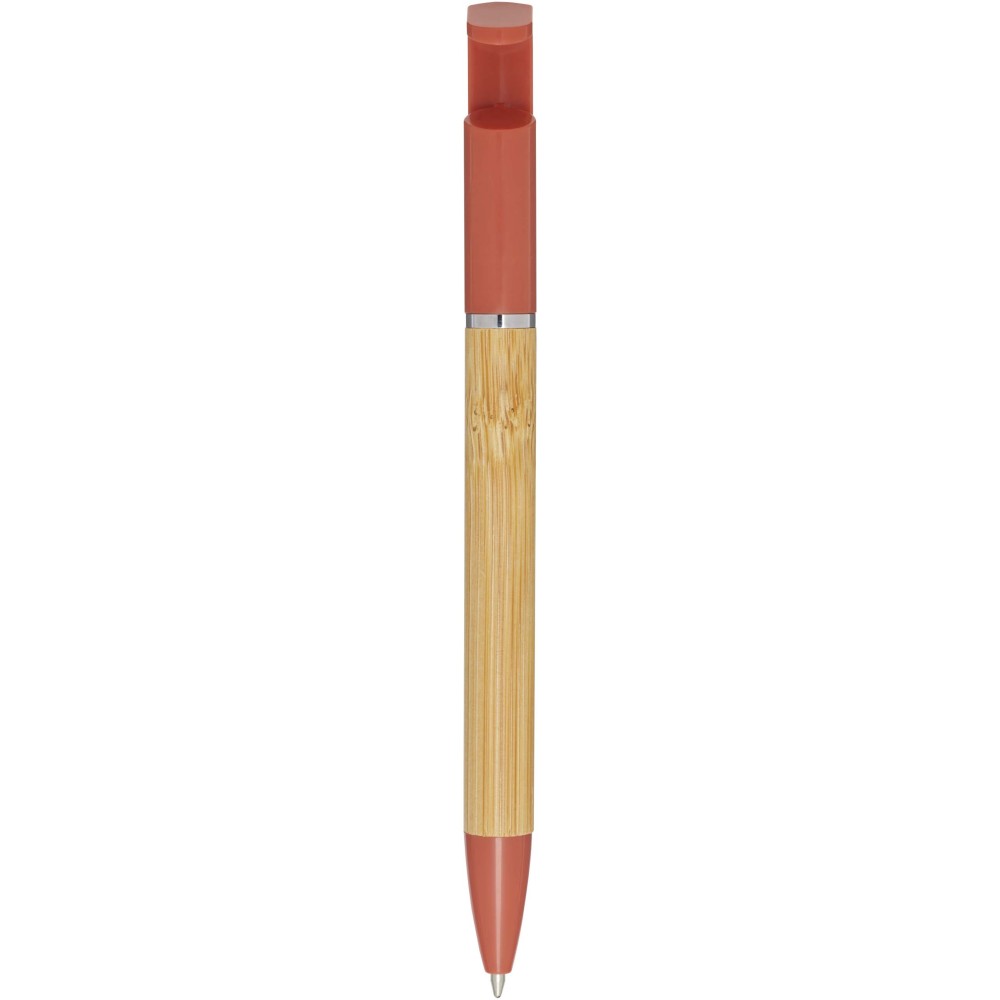Bambusz golyóstoll, amely telefontartóként is funkcionál. A gomb és a középső gyűrű újrahasznosított műanyagból, a hegy rézből, a tollteste pedig felelősen beszerzett bambuszból készült. Fekete tollbetéttel. Írási hossz: 1000 méter. Tollhegy mérete: 1,0 mm. Emblémázás: Tamponnyomás, UV nyomtatás