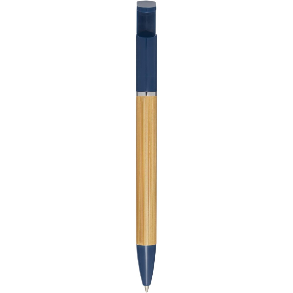 Bambusz golyóstoll, amely telefontartóként is funkcionál. A gomb és a középső gyűrű újrahasznosított műanyagból, a hegy rézből, a tollteste pedig felelősen beszerzett bambuszból készült. Kék tollbetéttel. Írási hossz: 1000 méter. Tollhegy mérete: 1,0 mm. Emblémázás: Tamponnyomás, UV nyomtatás