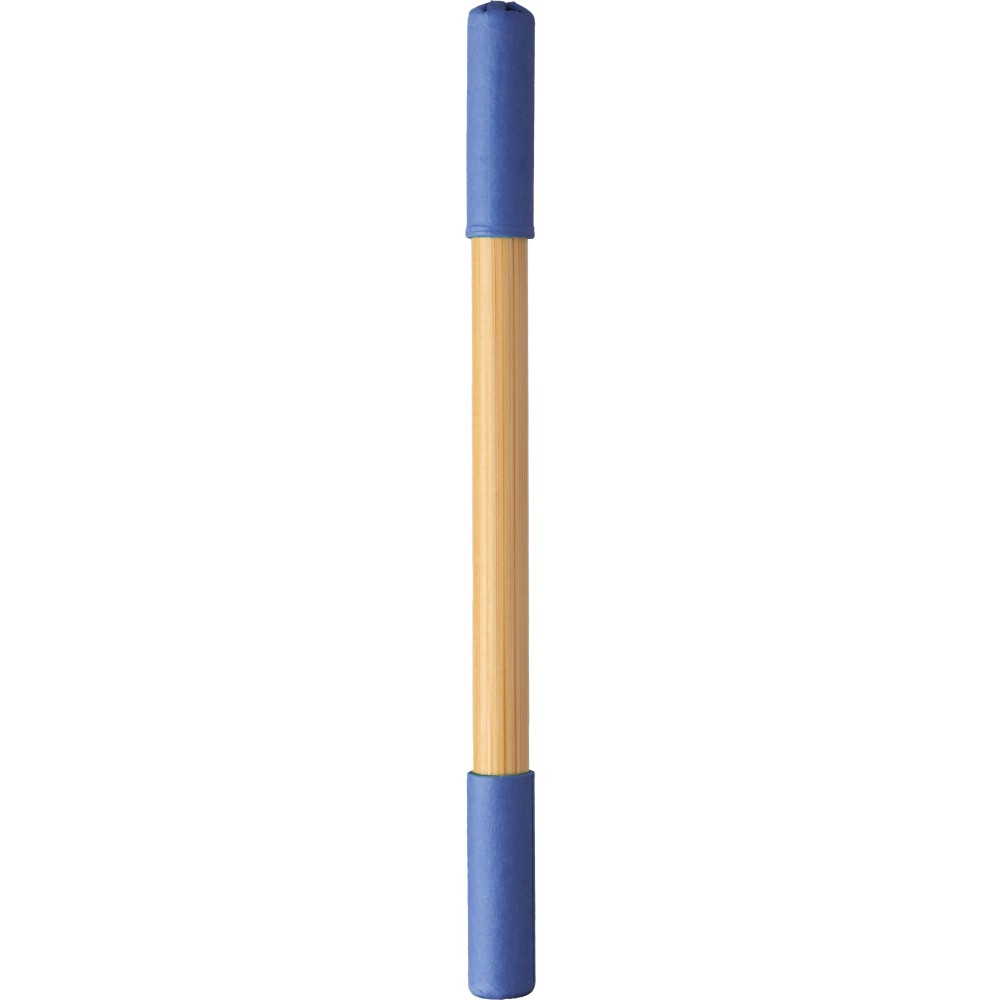 Bambusz végtelenített ceruza és golyóstoll. Az egyik oldalon végtelenített ceruza, a másikon golyóstoll, mindkettő színes karton kupakkal. Kék tollbetéttel. Emblémázás: Gravírozás, Tamponnyomás