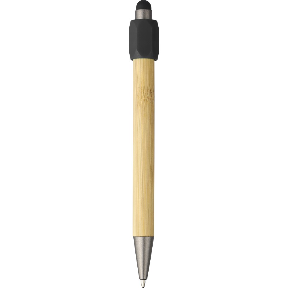 Bambusz golyóstoll újrahasznosított ABS pörgettyűvel és fekete érintővel a nyombógombon. A tollhegy vastagsága 1.0 mm, íráshossz: kb. 800 méter. Az újrahasznosított anyagra utaló logó a tollra van gravírozva. Emblémázás: Gravírozás, Tamponnyomás