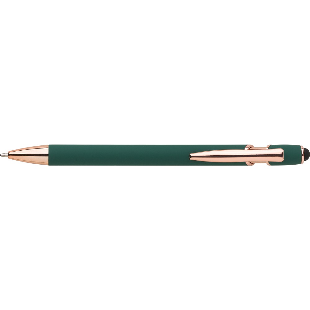 Alumínium golyóstoll rózsaarany részletekkel és érintővel, kék tollbetéttel. Emblémázás: Gravírozás, UV nyomtatás
