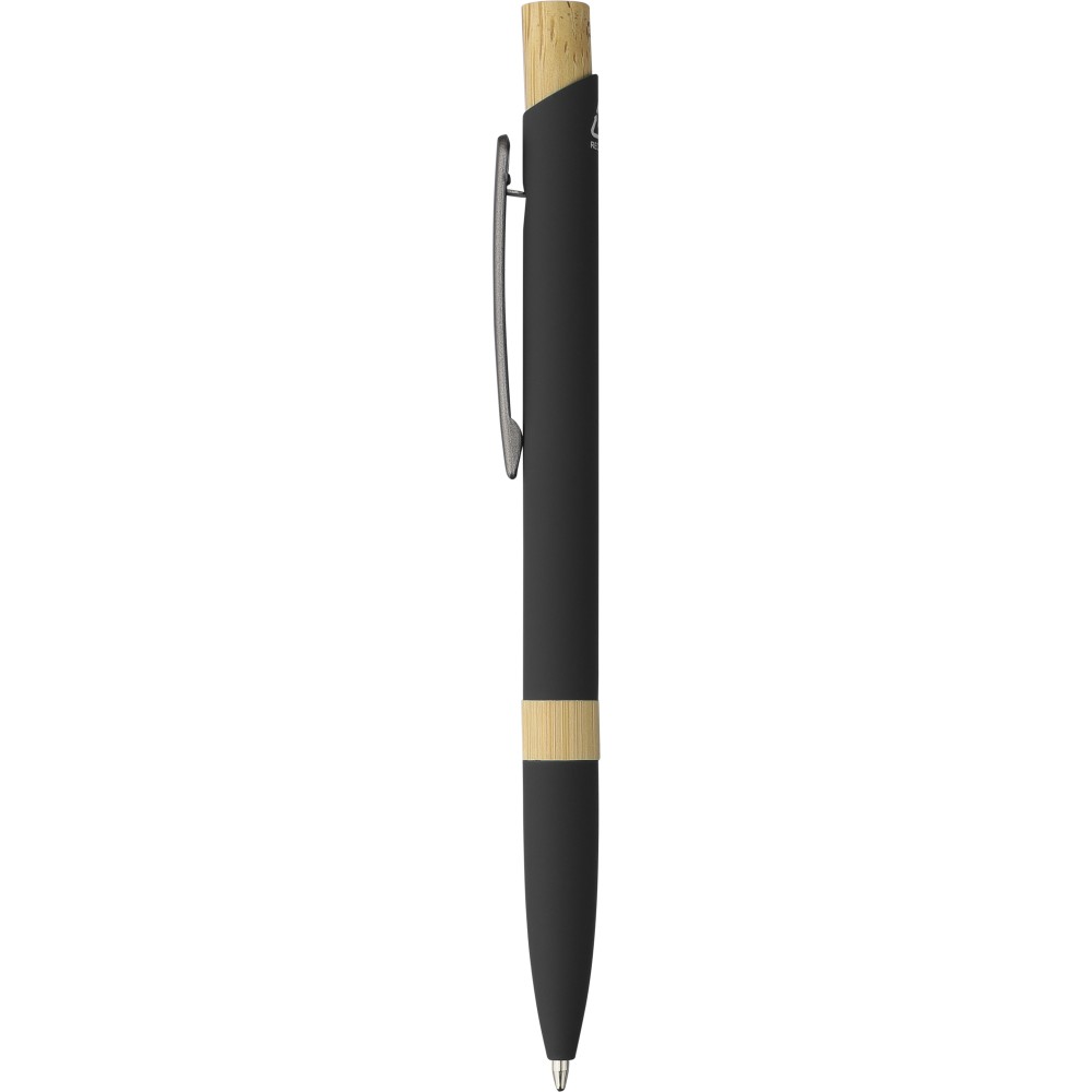 Golyóstoll újrahasznosított alumíniumból, gumírozott bevonattal, bambusz nyomógombbal és bambusz gyűrűvel a tolltesten. Kék tollbetéttel. A tollhegy vastagsága 1.0 mm, íráshossz: kb. 800 méter. Az újrahasznosított anyagra utaló logó a tollra van gravírozva. Emblémázás: Gravírozás