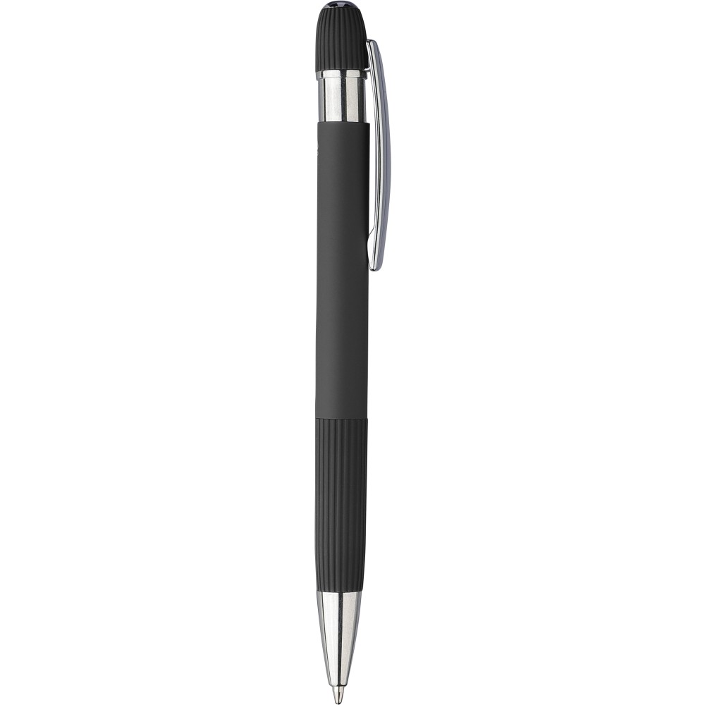Újrahasznosított alumínium golyóstoll gumírozott felülettel. Bordázott részletekkel a markolaton és a tetején, krómozott műanyag heggyel és fém klipsszel ellátott nyomógombbal. Lézergravírozott újrahasznosított logóval. Kék tintával. Emblémázás: Gravírozás