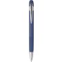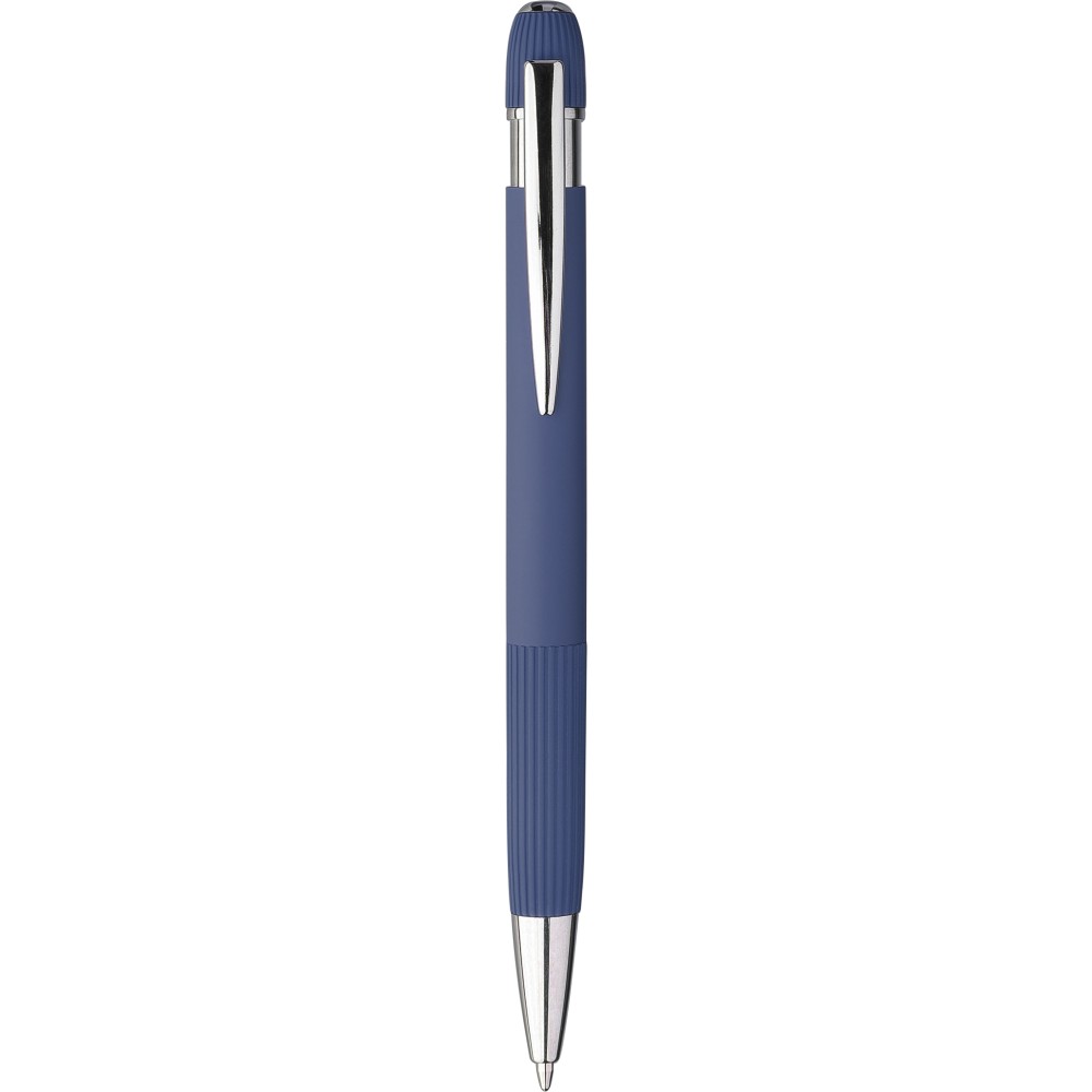 Újrahasznosított alumínium golyóstoll gumírozott felülettel. Bordázott részletekkel a markolaton és a tetején, krómozott műanyag heggyel és fém klipsszel ellátott nyomógombbal. Lézergravírozott újrahasznosított logóval. Kék tintával. Emblémázás: Gravírozás