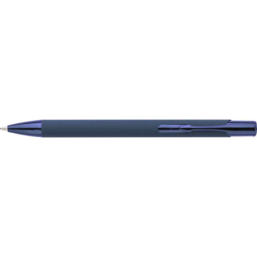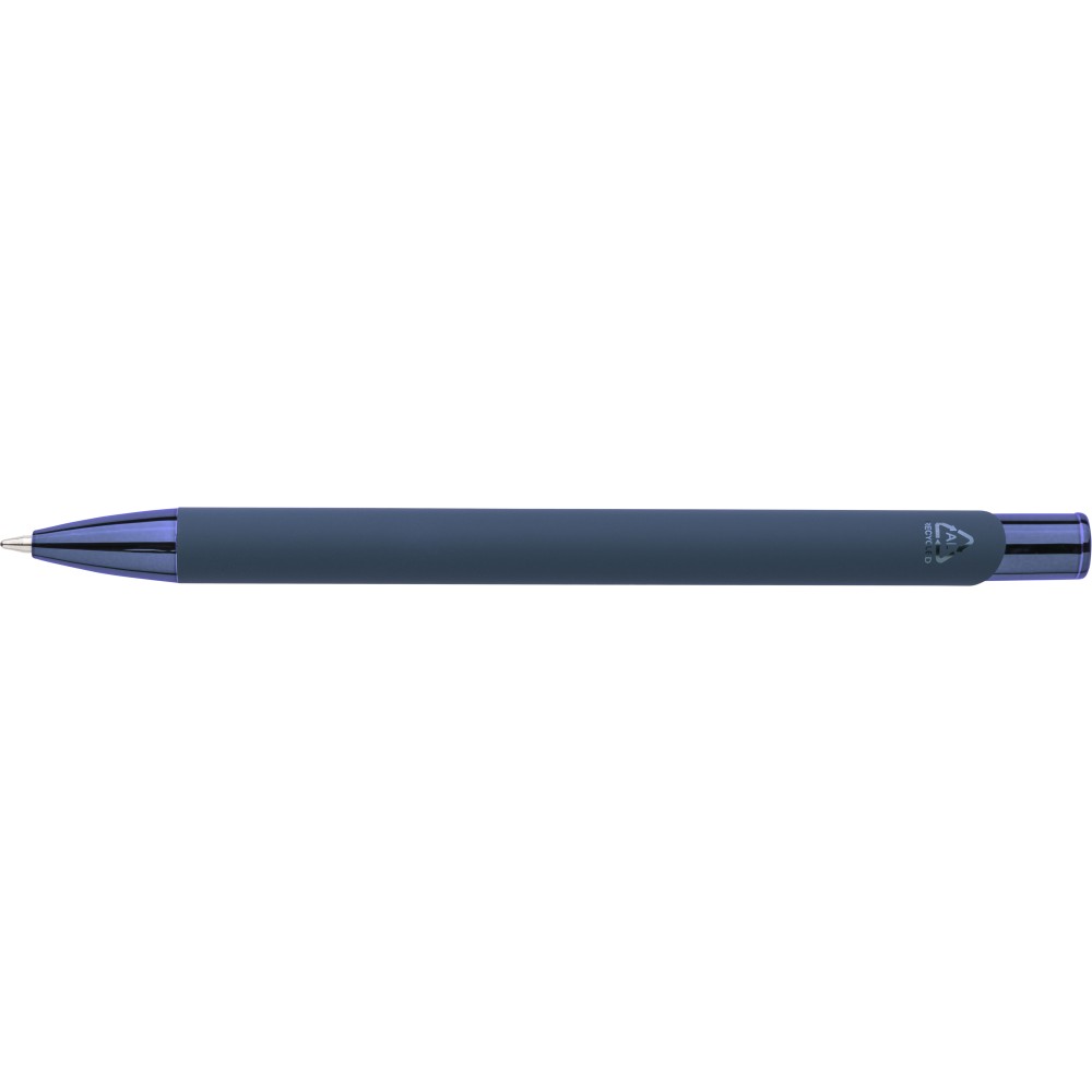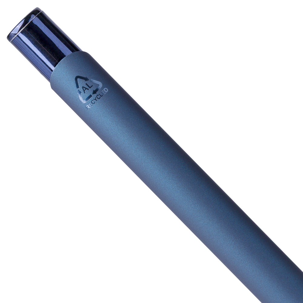 Újrahasznosított alumíniumból készült, gumírozott felületű golyóstoll, a toll színével harmonizáló UV-bevonatú műanyag és fém díszítéssel. Gravírozás után fényes tükörhatás jelenik meg. A tolltesten gravírozott recycled (újrahasznosított) alapanyagra utaló logó található. Megközelítőleg 800 méter íráshosszúságú, kék színű tollbetéttel. Emblémázás: UV nyomtatás,