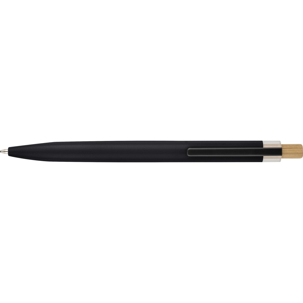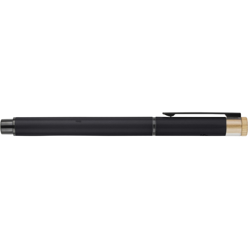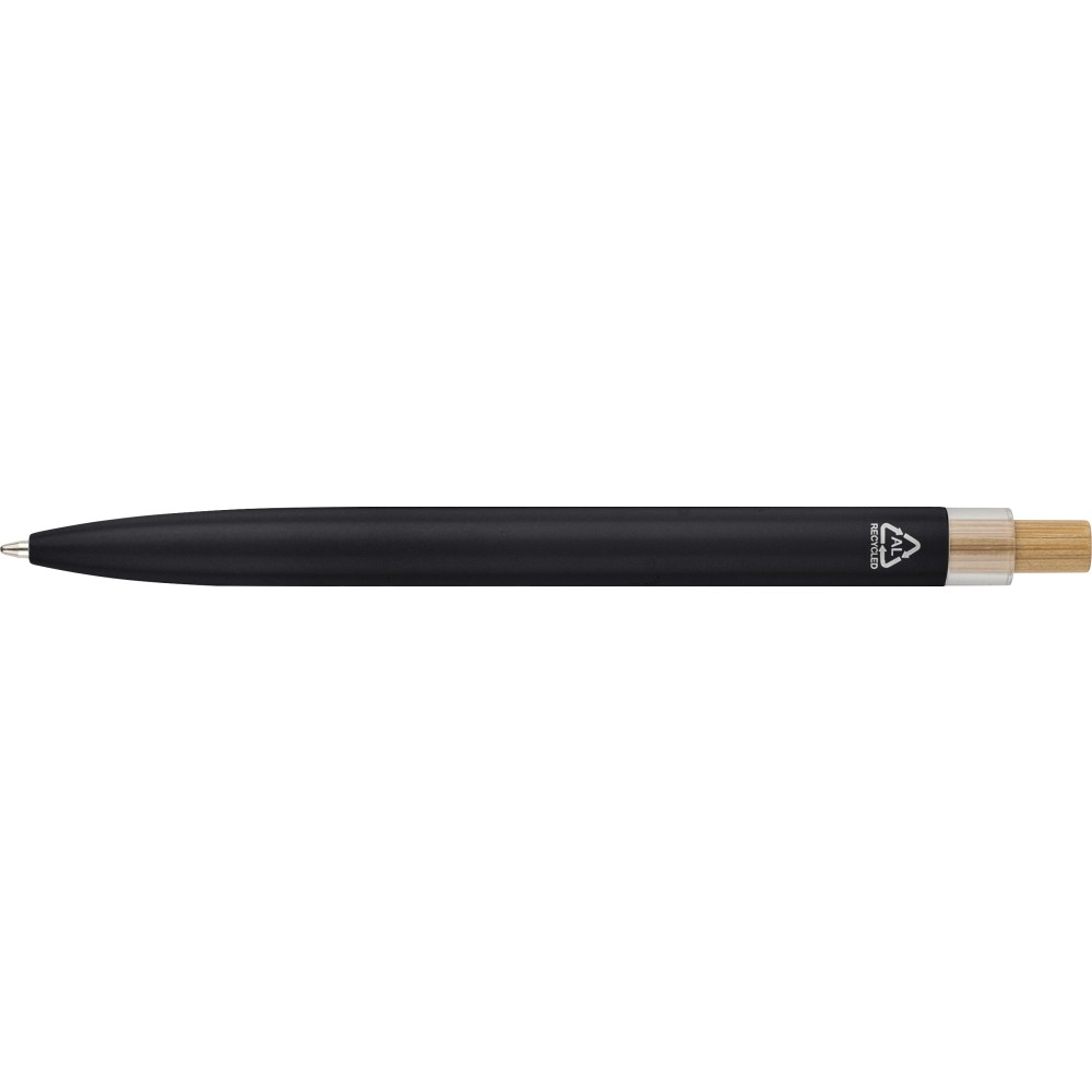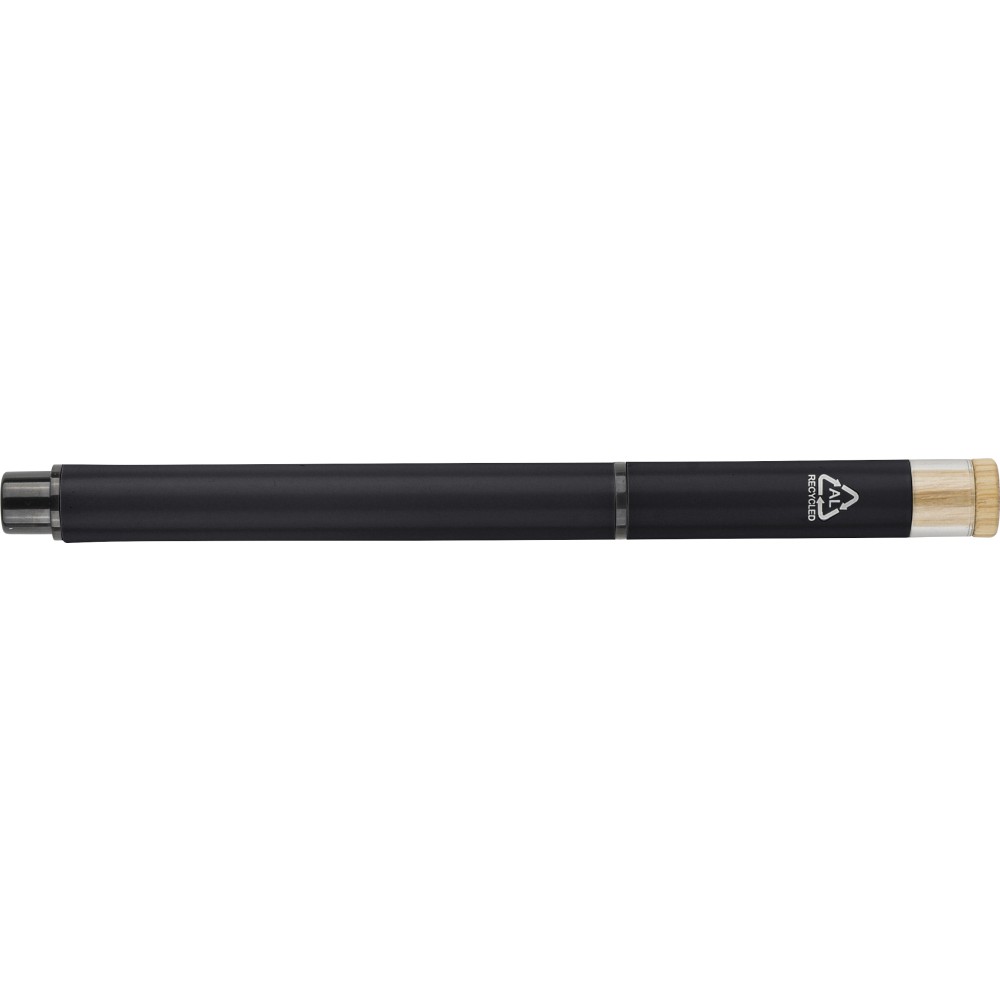 Újrahasznosított alumíniumból készült, lakkozott tollszett golyóstollal és rollerball tollal. A golyóstoll bambusz nyomógombbal, rPET díszítéssel és fém klippel rendelkezik, míg a rollerball toll bambusz/rPET kupakdíszítéssel és hozzá illeszkedő klippel. A tolltesten gravírozott recycled (újrahasznosított) alapanyagra utaló logó található mindkét toll esetében. A golyóstoll kb. 700 méter, a roller toll kb. 500 méter íráskapacitású, mindkettő kék színű tollbetéttel. Színes, újrahasznosított kartonból készült ajándékdobozba csomagolva. Emblémázás: Tamponnyomás, UV nyomtatás