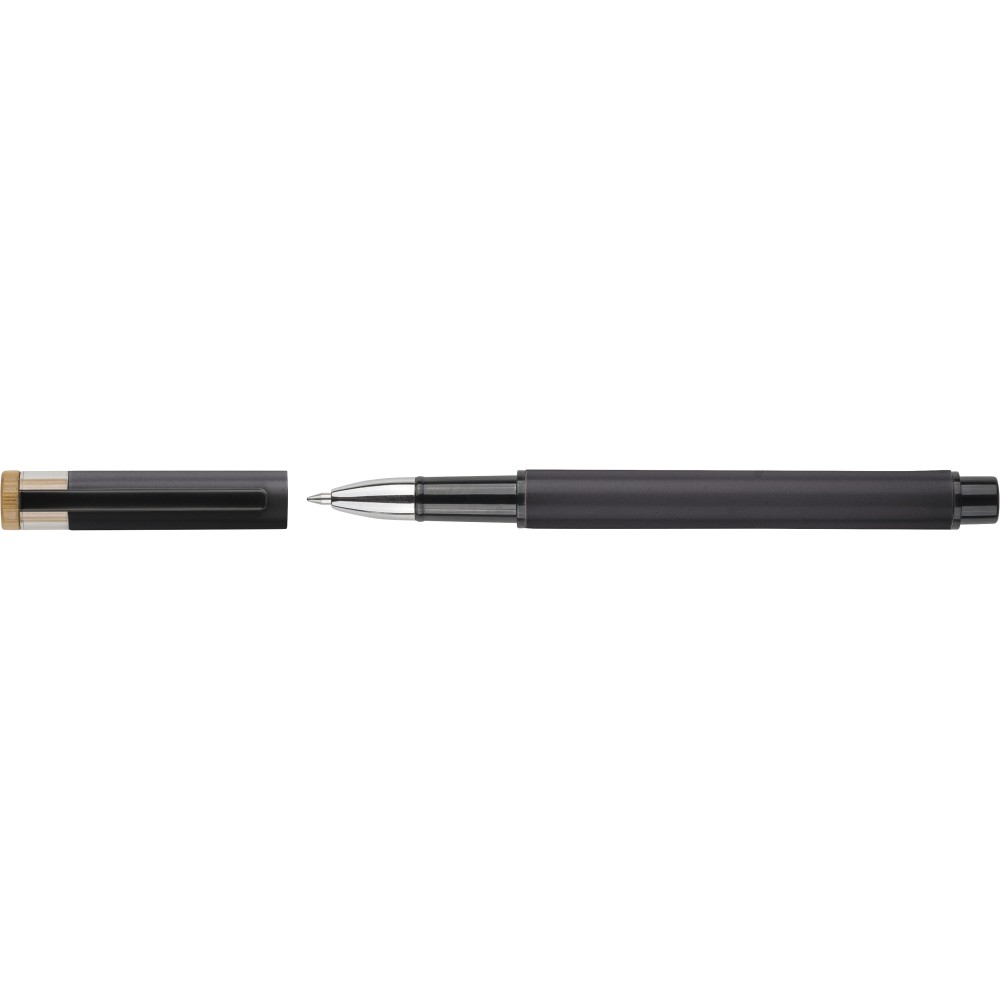 Újrahasznosított alumíniumból készült, lakkozott tollszett golyóstollal és rollerball tollal. A golyóstoll bambusz nyomógombbal, rPET díszítéssel és fém klippel rendelkezik, míg a rollerball toll bambusz/rPET kupakdíszítéssel és hozzá illeszkedő klippel. A tolltesten gravírozott recycled (újrahasznosított) alapanyagra utaló logó található mindkét toll esetében. A golyóstoll kb. 700 méter, a roller toll kb. 500 méter íráskapacitású, mindkettő kék színű tollbetéttel. Színes, újrahasznosított kartonból készült ajándékdobozba csomagolva. Emblémázás: Tamponnyomás, UV nyomtatás