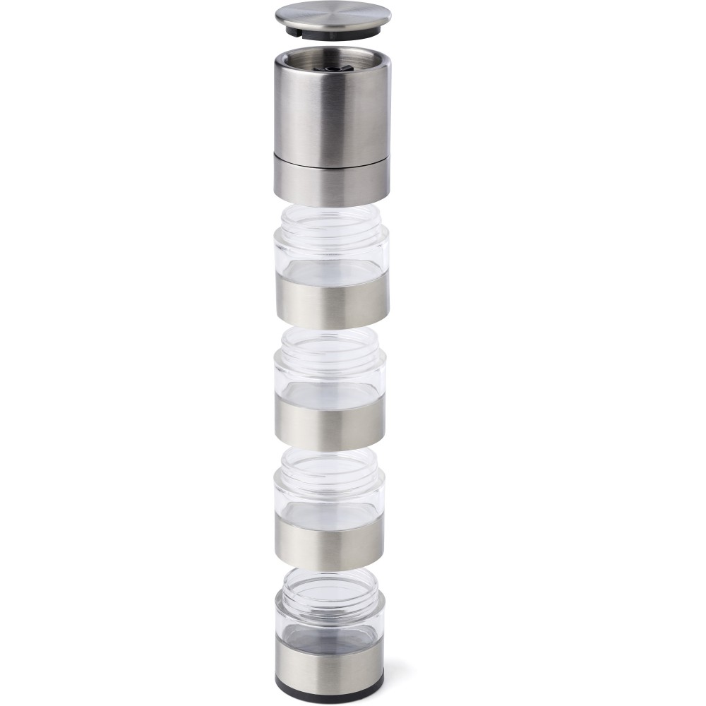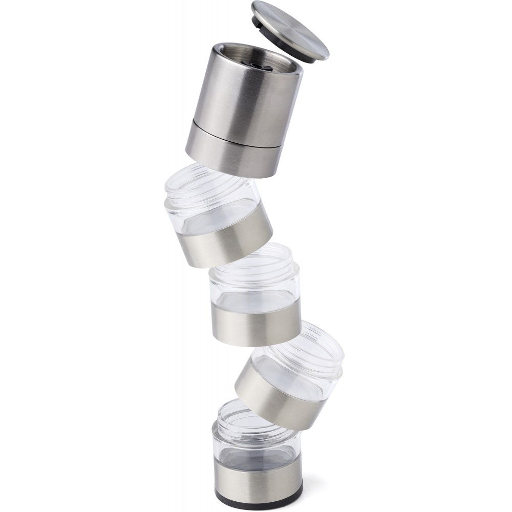 Rozsdamentes acél fűszerdaráló 4 résszel és kerámia őrlővel. Egyenként csomagolva, barna kartondobozban. Emblémázás: Gravírozás, Tamponnyomás