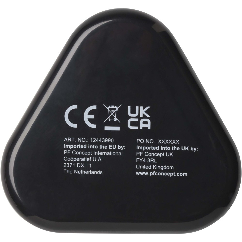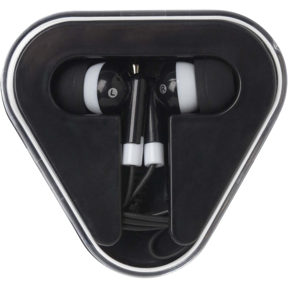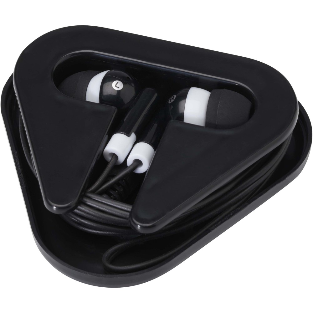 A Rebel fülhallgató egyszerű és praktikus megoldás, amely bármilyen 3,5 mm-es audio csatlakozóval rendelkező eszközzel használható. A fülhallgató újrahasznosított műanyagból készült, háromszög alakú kábeltartó tokban érkezik, amely megóvja a külső sérülésektől. Emblémázás: Tamponnyomás, UV nyomtatás
