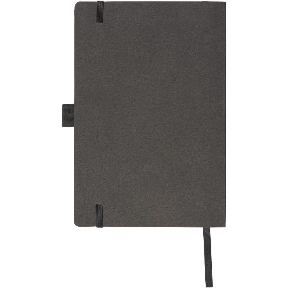 Puha borítású (A/5) jegyzetfüzet, gumis záródással, jelölővel, tolltartó hurokkal, hátoldalán zsebbel jegyzetek tárolására. 80 db krém színű vonalas (80gsm) lappal. Fekete papírhüvelybe csomagolva. Emblémázás: Szitanyomás, Tamponnyomás