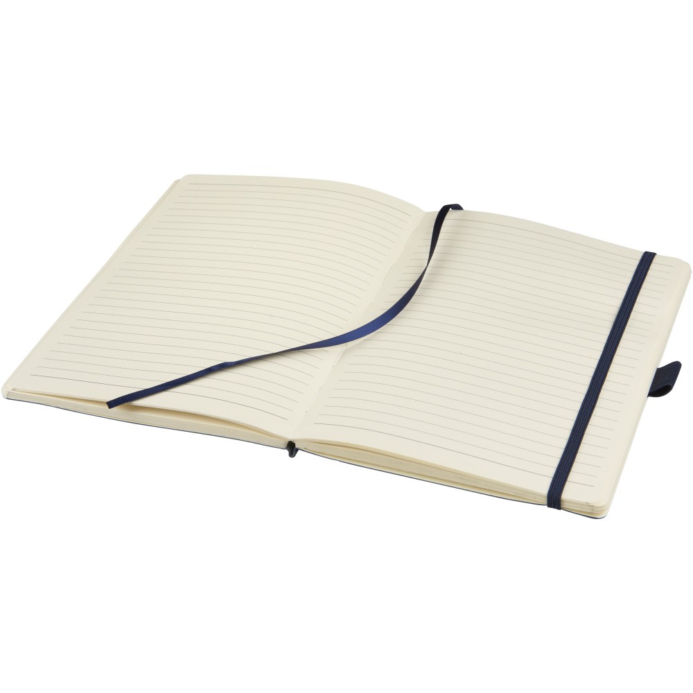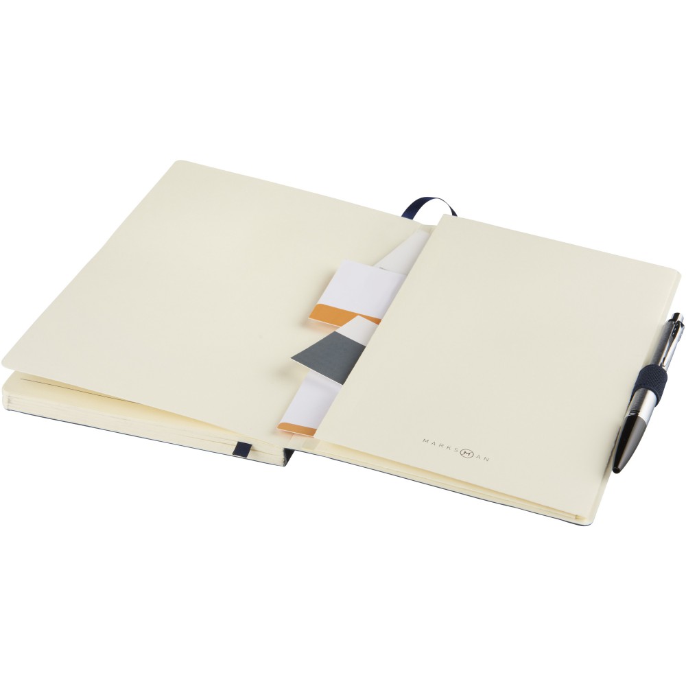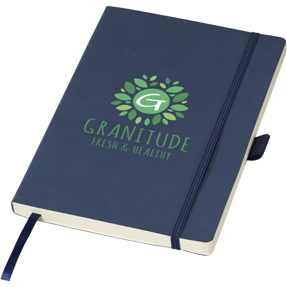 Puha borítású (A/5) jegyzetfüzet, gumis záródással, jelölővel, tolltartó hurokkal, hátoldalán zsebbel jegyzetek tárolására. 80 db krém színű vonalas (80gsm) lappal. Fekete papírhüvelybe csomagolva. Emblémázás: Szitanyomás, Tamponnyomás