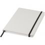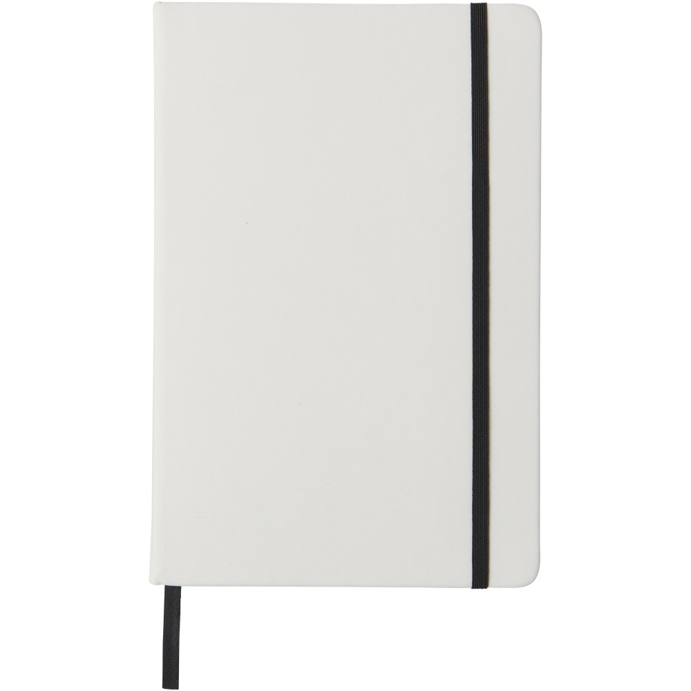 Fehér A5-ös füzet színes, gumis pánttal és könyvjelzővel, 96 db vonalas lappal. Emblémázás: Szitanyomás, Tamponnyomás, UV nyomtatás