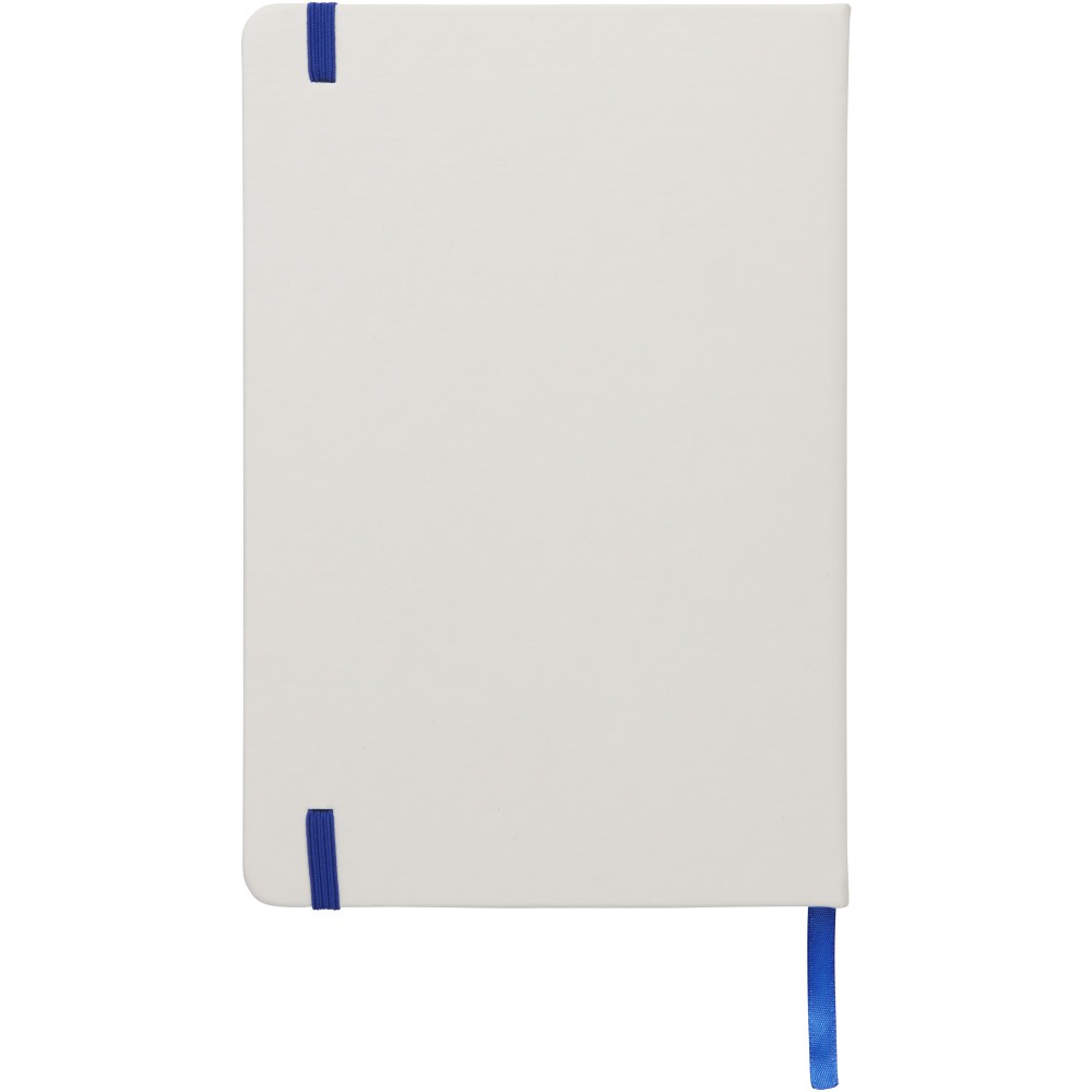 Fehér A5-ös füzet színes, gumis pánttal és könyvjelzővel, 96 db vonalas lappal. Emblémázás: Szitanyomás, Tamponnyomás, UV nyomtatás