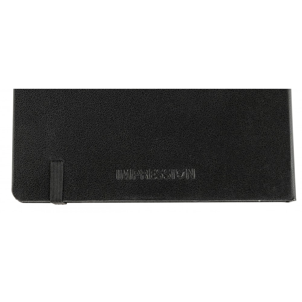 A5-ös füzet gumis záródással, 128 vonalas, dátumjelzéses lappal és papírzsebbel a hátsó, belső borítón. A külső hátsó borítón IMPRESSION logó található. PVC, 80 g papír. Emblémázás: Tamponnyomás, UV nyomtatás