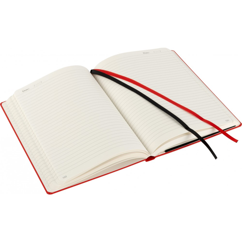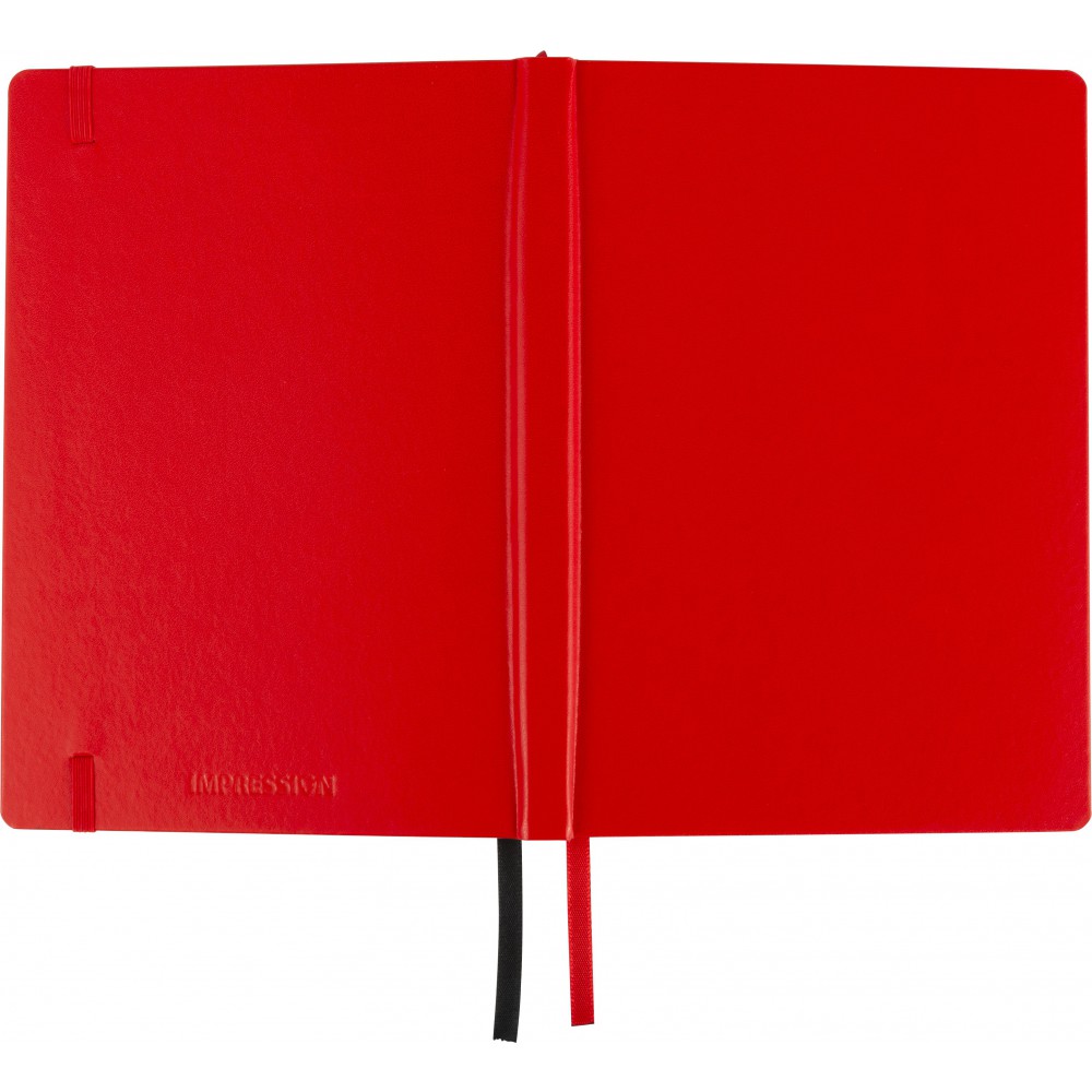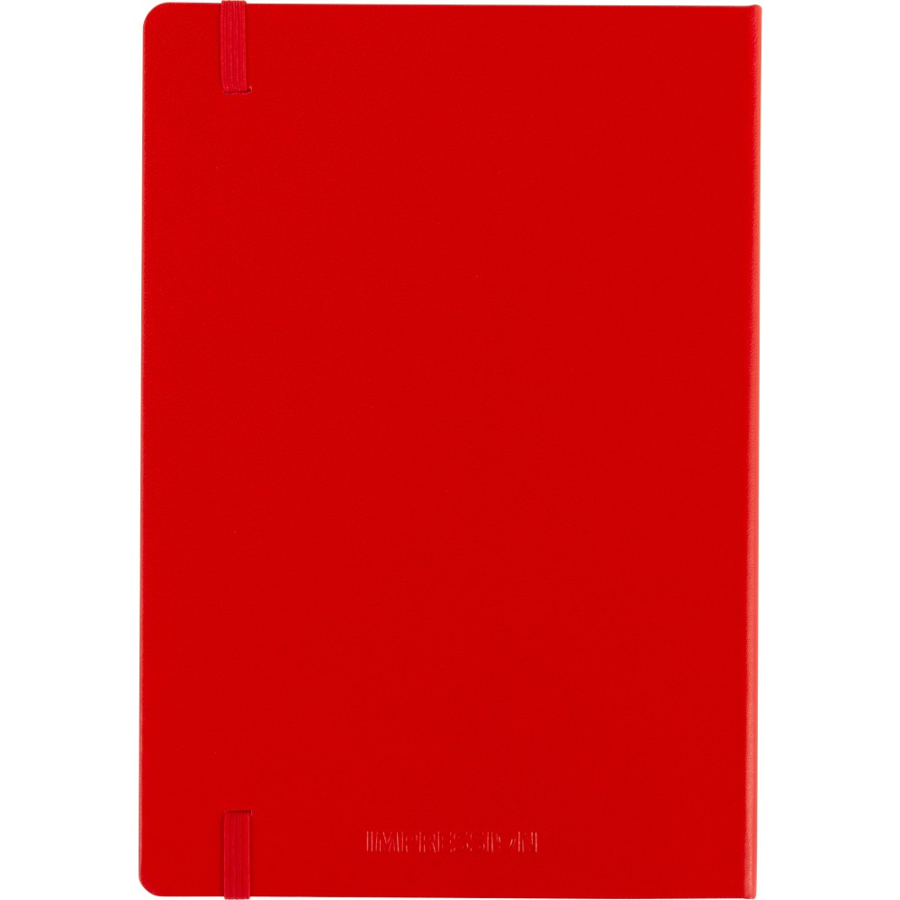 A5-ös füzet gumis záródással, 128 vonalas, dátumjelzéses lappal és papírzsebbel a hátsó, belső borítón. A külső hátsó borítón IMPRESSION logó található. PVC, 80 g papír. Emblémázás: Tamponnyomás, UV nyomtatás