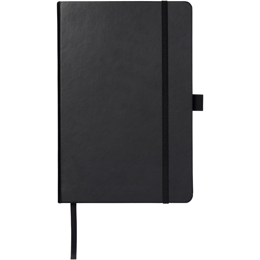 Műbőr A5-ös (14,2 cm x 21,4 cm) jegyzetfüzet gumiszalaggal, szalagjelölővel, tollhurokkal és harmonika hátsó zsebbel. 96 db vonalas krémszínű lapot tartalmaz (80 g/m2). Emblémázás: Tamponnyomás, UV nyomtatás