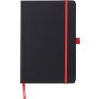 A5 füzet 96 vonalas lappal, könyvjelzővel, gumis zárópánttal. Lézergravírozás után a gravírozott felület színe megegyezik a gumipánt színével. PU anyag. Emblémázás: Tamponnyomás, UV nyomtatás