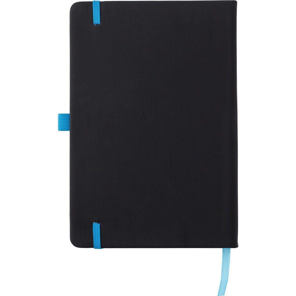 A5 füzet 96 vonalas lappal, könyvjelzővel, gumis zárópánttal. Lézergravírozás után a gravírozott felület színe megegyezik a gumipánt színével. PU anyag. Emblémázás: Tamponnyomás, UV nyomtatás