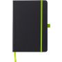 A5 füzet 96 vonalas lappal, könyvjelzővel, gumis zárópánttal. Lézergravírozás után a gravírozott felület színe megegyezik a gumipánt színével. PU anyag. Emblémázás: Tamponnyomás, UV nyomtatás