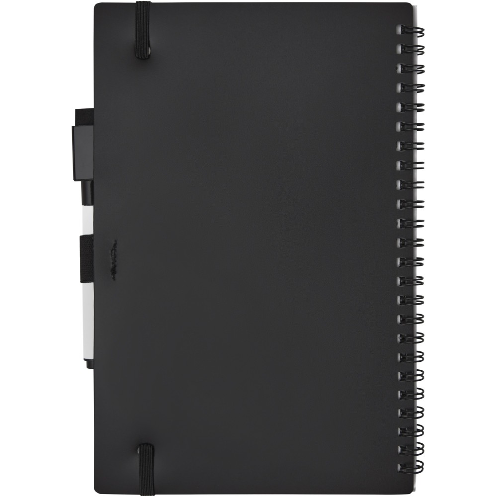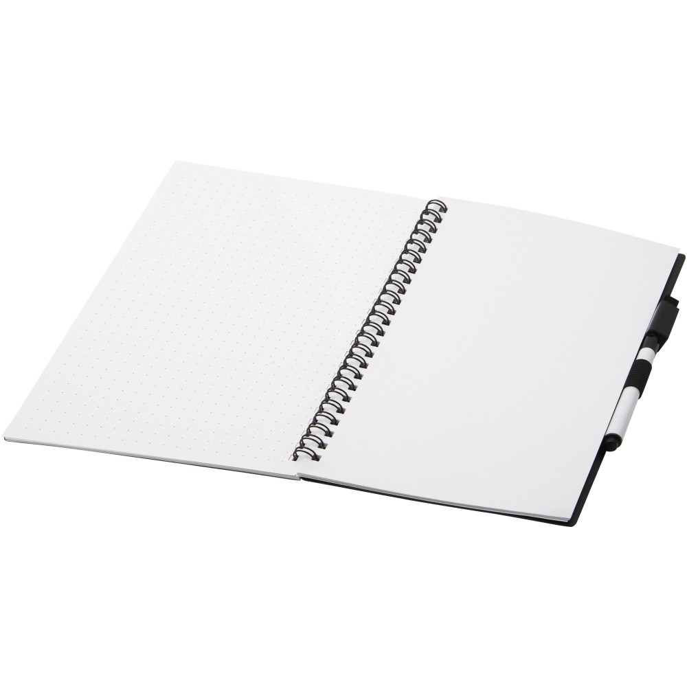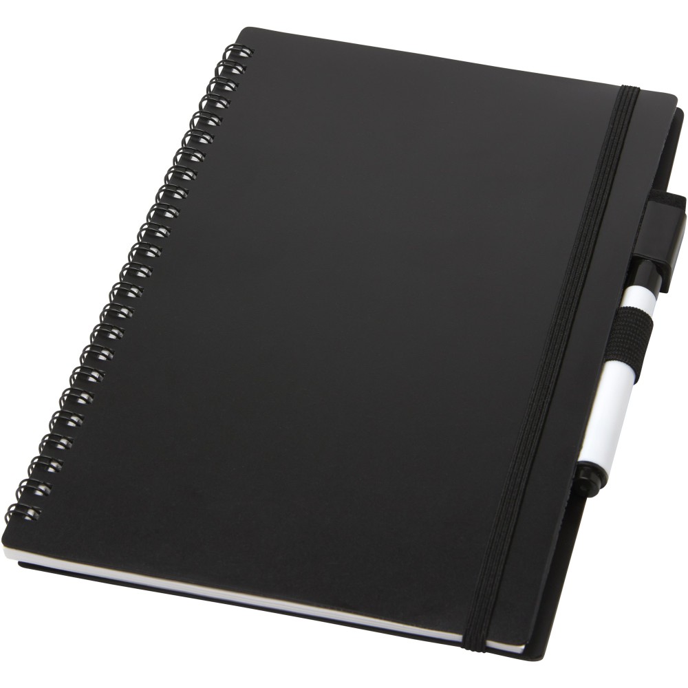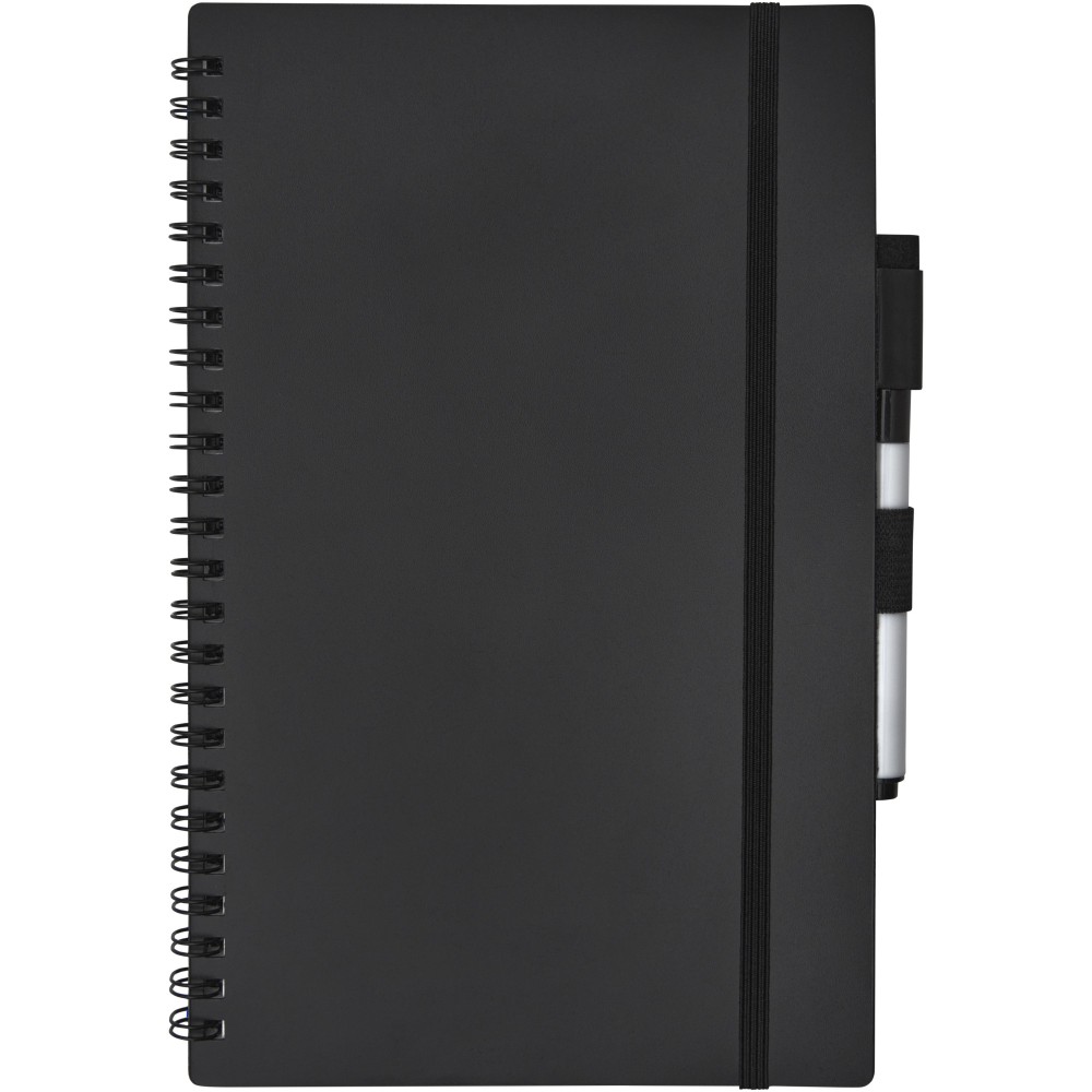 Fenntartható alapanyagból készült füzet a papírfelhasználás csökkentésére összpontosít a környezet kímélése érdekében. Egy idő után jegyzetelés, rajzolás vagy ötletelés után az oldalak megtisztíthatók a markeren lévő radírral, hogy újra felhasználhassák az oldalakat. Szokásos szövet kendővel is tisztítható (nem tartozék). 20 lapot (40 oldal) tartalmaz, félig pontozott és félig üres elrendezéssel, valamint egy fekete szövegkiemelőt. Emblémázás: Szitanyomás, Tamponnyomás