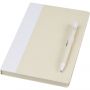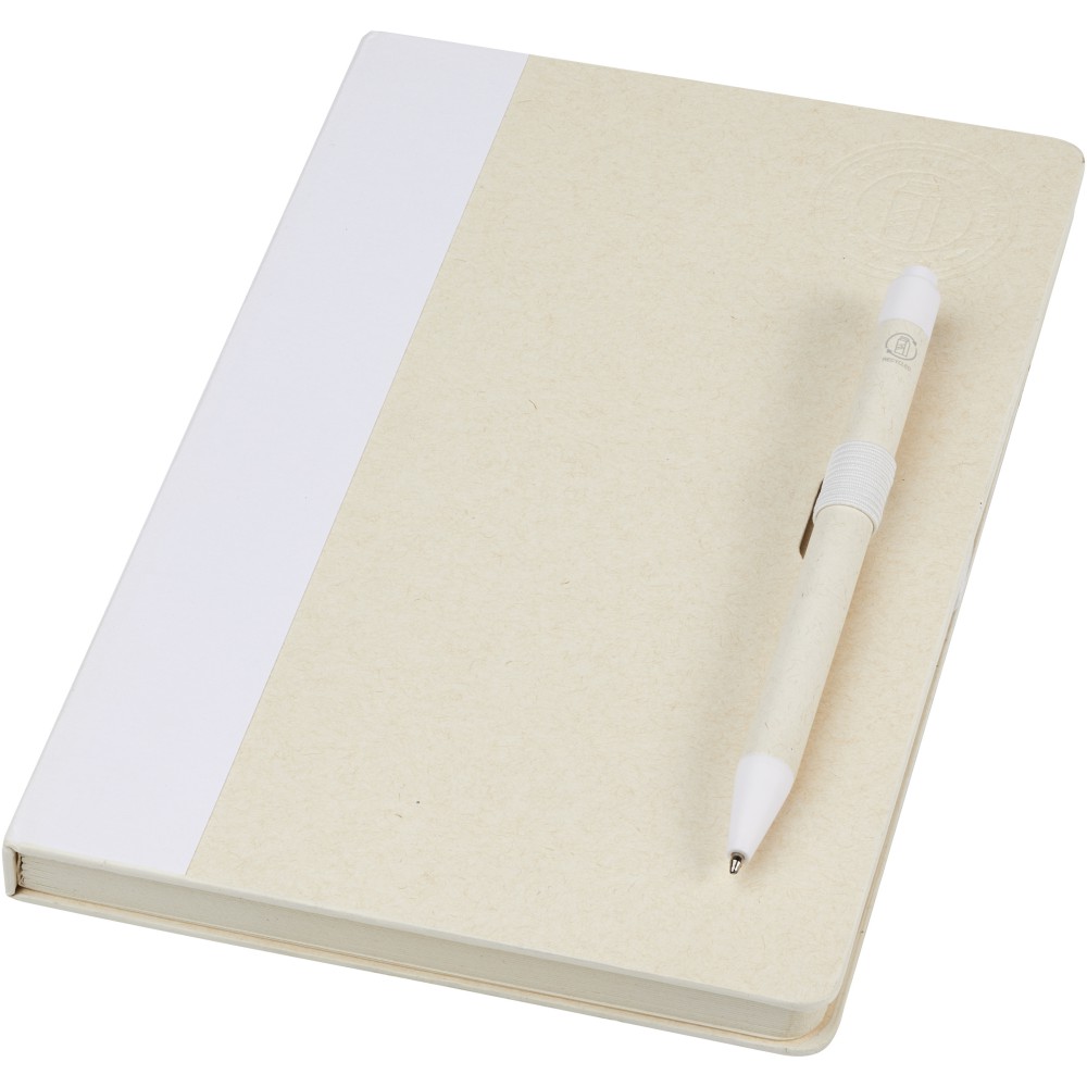 A5 méretű füzet és golyóstoll készlet. A jegyzetfüzet 80 vonalas lapot (80 g/m2) tartalmaz, amelyek újrahasznosított tejes kartondobozokból készülnek (akár 70%), színes papírgerinccel és egy tollhurokkal. A tollhurokban egy nyomógombos golyóstoll található a jegyzetfüzet színéhez illő színben. A toll teste ugyanabból az újrahasznosított anyagból készült, a gomb, a klipsz és a hegy pedig színes PLA műanyagból készült. A toll fekete tollbetéttel érkezik. A használt tejesdobozokat összegyűjtik, válogatják, feldolgozzák és papírrá alakítják, így a hulladékból hasznos termék készül. Emblémázás: Szitanyomás, Tamponnyomás